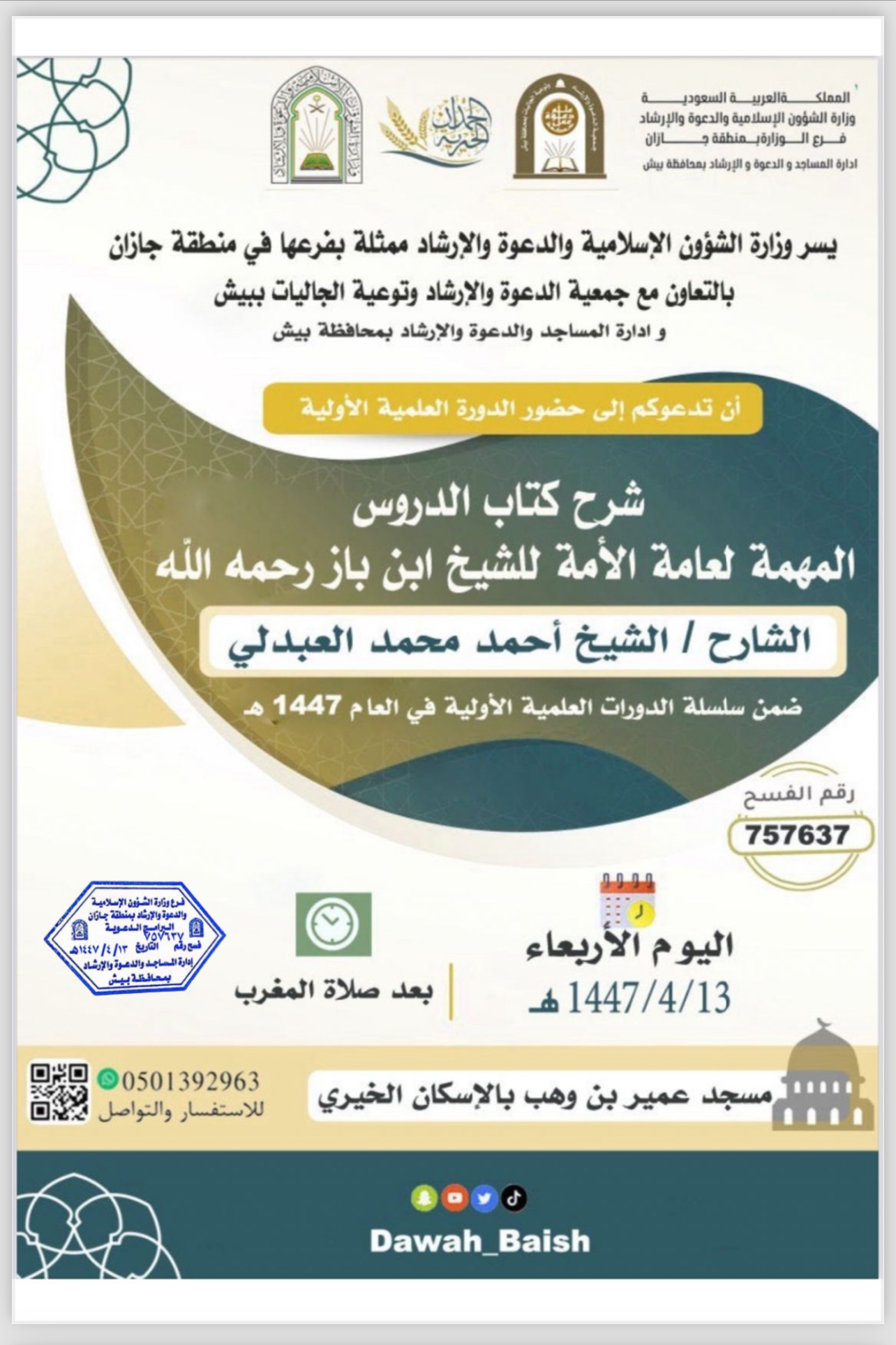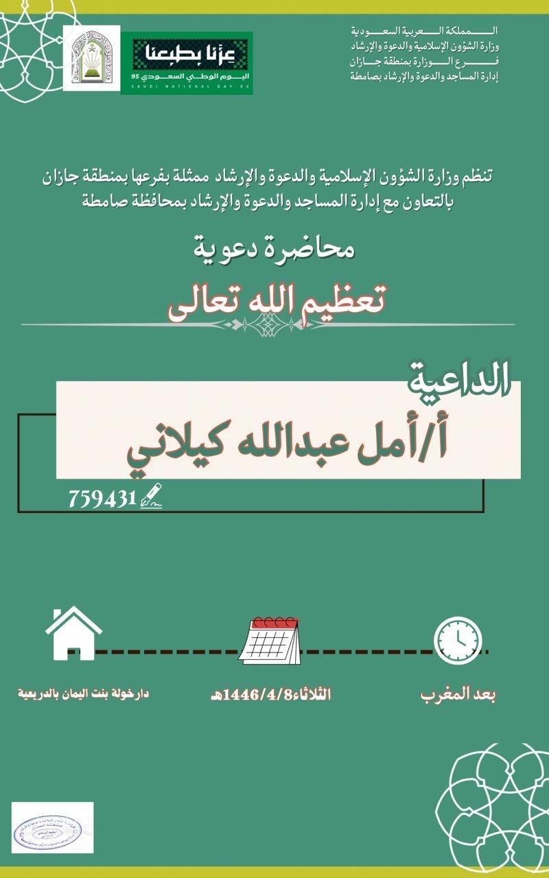 الشؤون الإسلامية بمنطقة جازان تنفذ محاضرات دعوية في محافظة بيش ينفذ فرع وزارة الشؤون الإسلامية والدعوة والإرشاد بمنطقة جازان، ممثلاً بمركز الدعوة بمحافظة بيش، سلسلة من المحاضرات الدعوية ضمن البرنامج الدعوي الشهري، وذلك ابتداءً من اليوم الأربعاء الثاني من شهر ربيع 02/ربيع الثاني/1447 التفاصيل