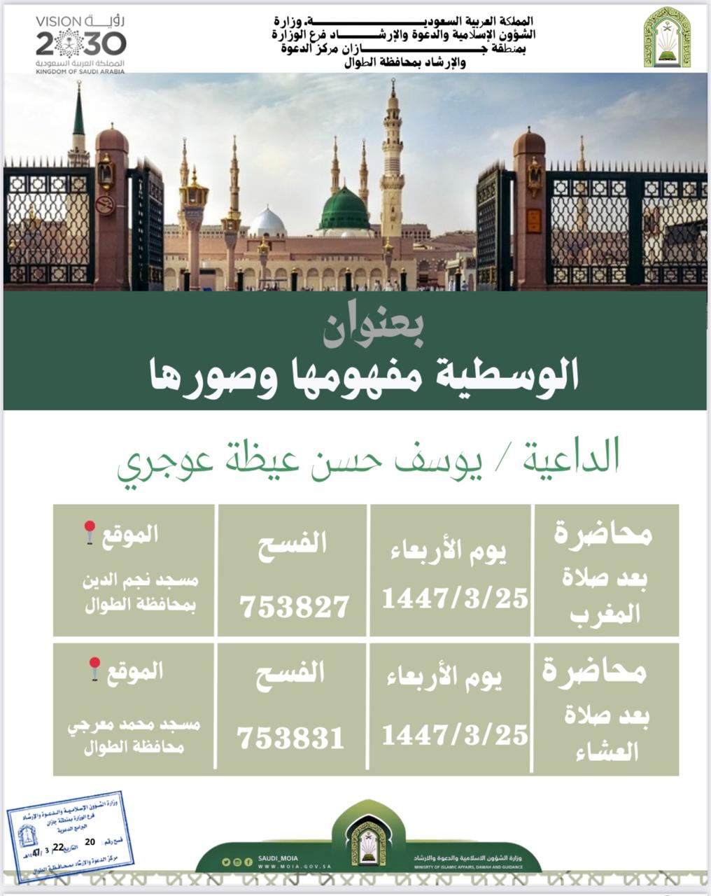 الشؤون الإسلامية بجازان تنظم سلسلة من المحاضرات الدعوية بمحافظة الطوال ينظم فرع وزارة الشؤون الإسلامية والدعوة والإرشاد بمنطقة جازان، ممثلاً بمركز الدعوة والإرشاد بمحافظة الطوال، سلسلة من المحاضرات الدعوية بعنوان: “الوسطية مفهومها وصورها”، وذلك خلال الفترة من 22 23/ربيع الأول/1447 التفاصيل