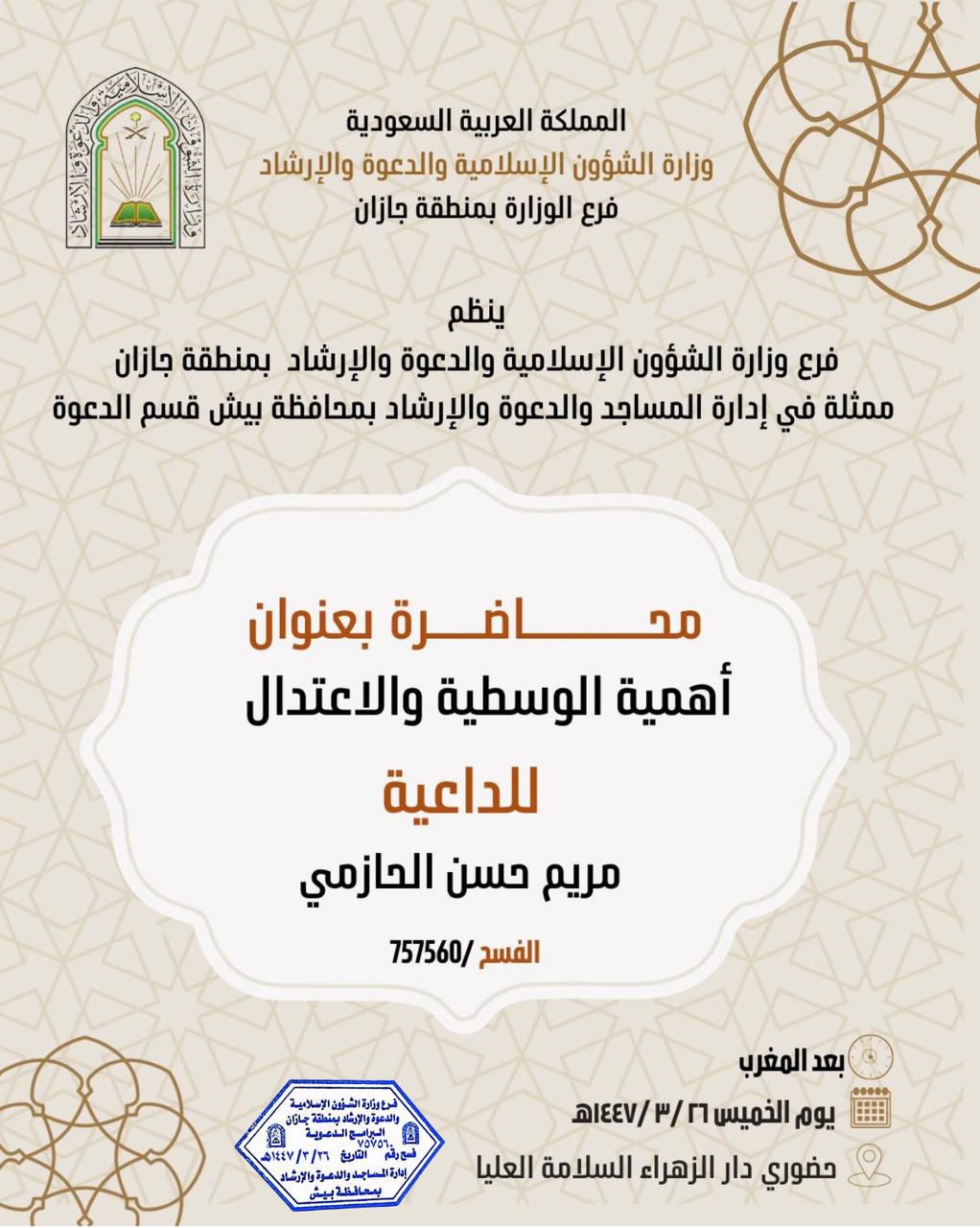 الشؤون الإسلامية بجازان تنفذ محاضرات دعوية نسائية بمحافظتي ضمد وبيش ينفذ فرع وزارة الشؤون الإسلامية والدعوة والإرشاد بمنطقة جازان، ممثلاً بإدارتي المساجد في محافظتي ضمد وبيش، اليوم الثلاثاء الرابع والعشرين من شهر ربيع الأول لعام 1447هـ، عدداً من المحاضرات الدعوية التي 24/ربيع الأول/1447 التفاصيل