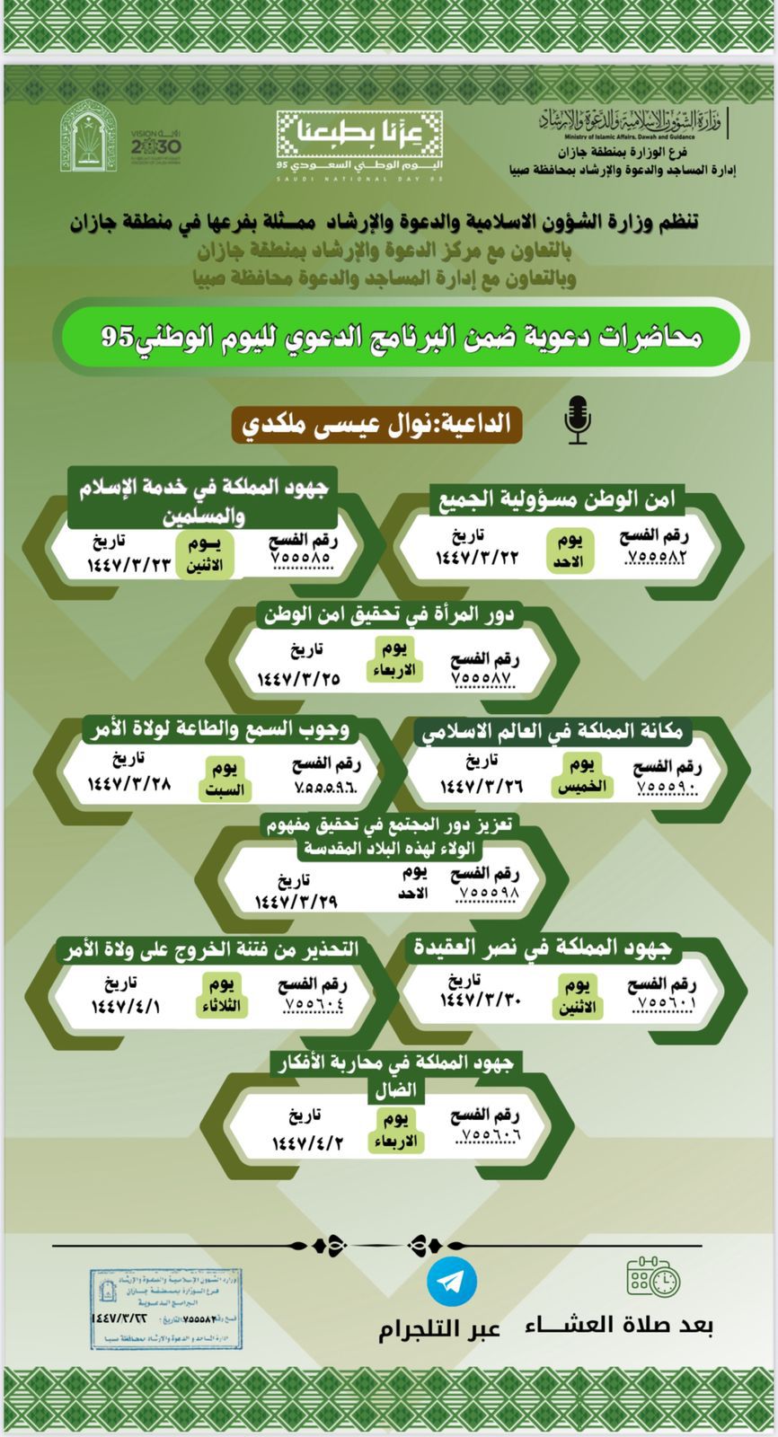 الشؤون الإسلامية في جازان تقيم ندوة علمية نسائية في محافظة ضمدأقام فرع وزارة الشؤون الإسلامية والدعوة والإرشاد في منطقة جازان ممثلا بإدارة مساجد محافظة ضمد ندوة علمية ( الانتماء لوطن التوحيد والسنة ) وذلك مساء أمس الاحد الثاني والعشرون من شهر ربيع الأول 1447 هجرية 23/ربيع الأول/1447 التفاصيل