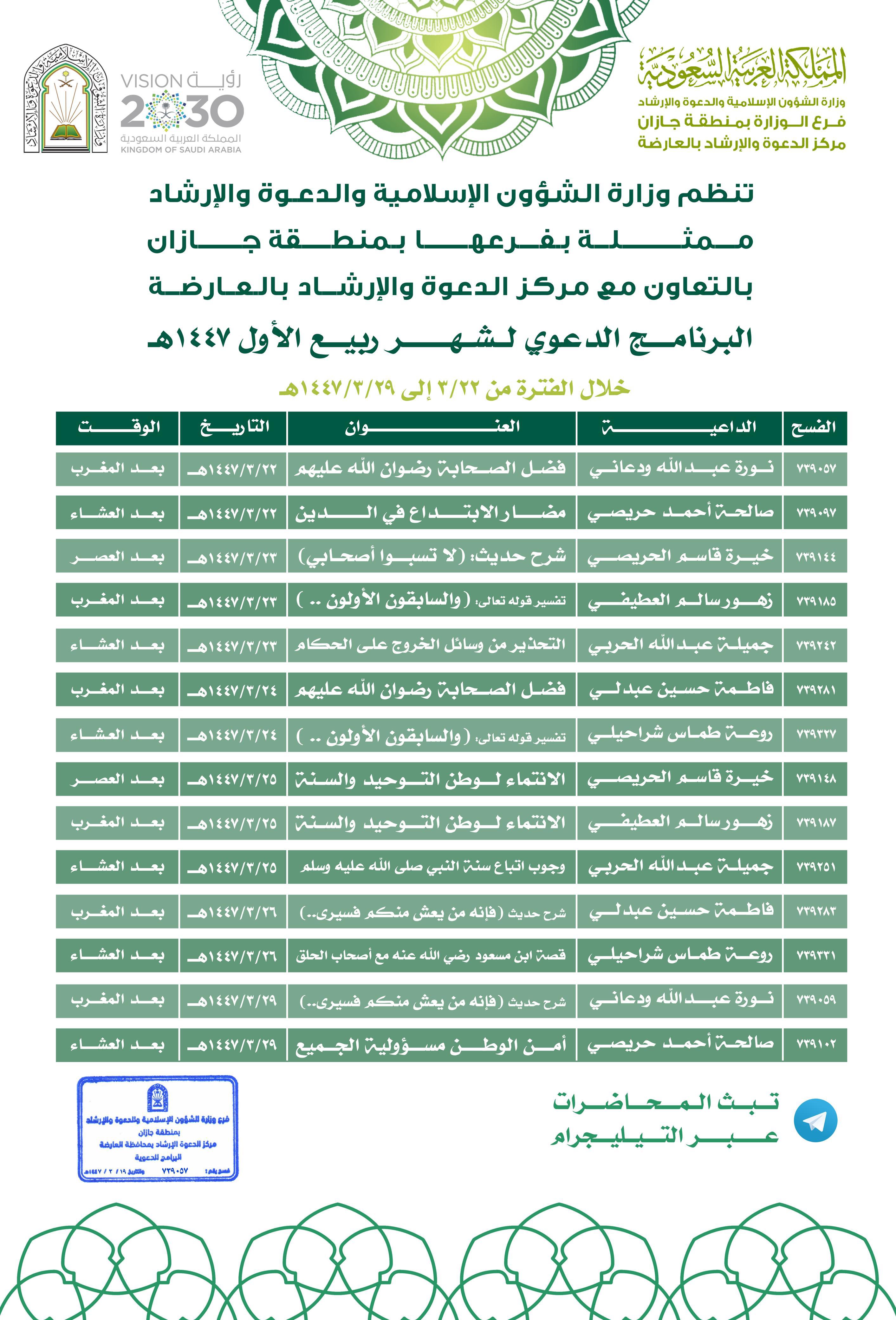 الشؤون الإسلامية بجازان تُطلق سلسلة مناشط دعوية في صبيا أطلق فرع وزارة الشؤون الإسلامية والدعوة والإرشاد بمنطقة جازان، ممثلاً بإدارة المساجد بمحافظة صبيا، سلسلة من المناشط الدعوية التي انطلقت مساء الأحد 22 ربيع الأول 1447هـ عبر البث المباشر، وتستمر حتى 25/ربيع الأول/1447 التفاصيل