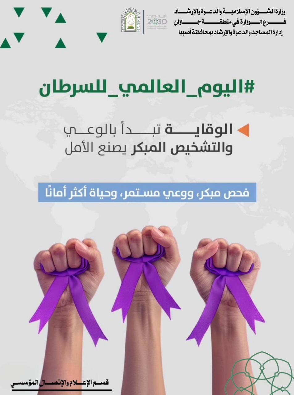 الشؤون الإسلامية في جازان تشارك في اليوم العالمي لمرض السرطان تشارك وزارةُ الشؤون الإسلامية والدعوة والإرشاد، ممثَّلةً بفرعها في منطقة جازان، في اليوم العالمي لمرض السرطان، الذي يوافق الرابع من شهر فبراير من كل عام ميلادي، وذلك ابتداءً من يوم الأربعاء السادس 16/شعبان/1447 التفاصيل