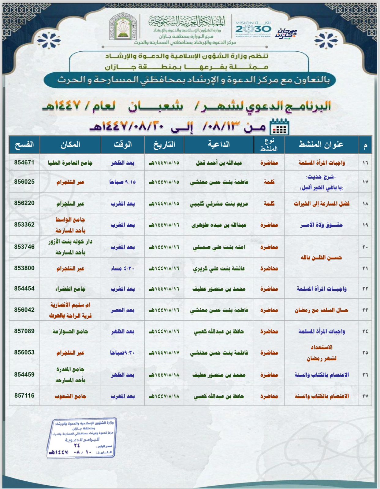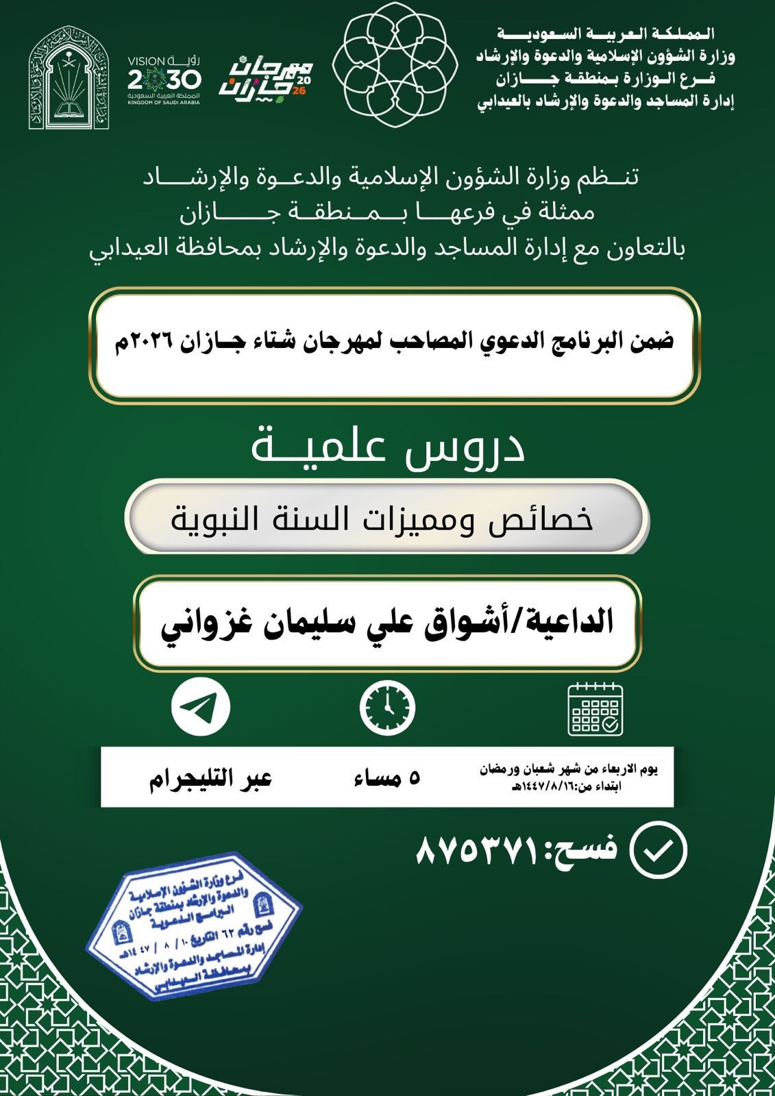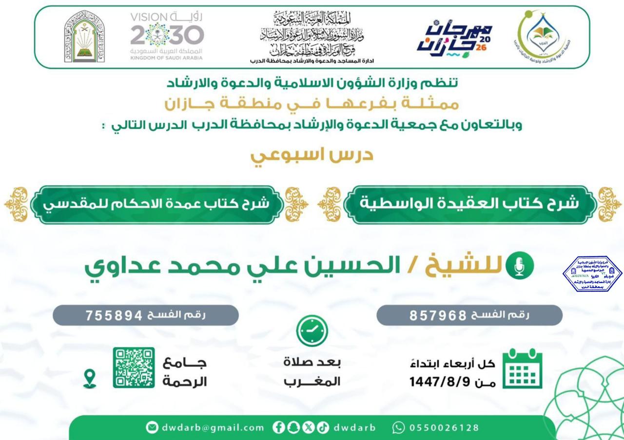 الشؤون الإسلامية بجازان تُنفّذ مناشط دعوية في محافظتي العارضة والعيدابي تُنفّذ وزارةُ الشؤون الإسلامية والدعوة والإرشاد، ممثّلةً بفرعها في منطقة جازان، عددًا من المناشط الدعوية في محافظتي العارضة والعيدابي، وذلك ضمن البرنامج الدعوي المصاحب لمهرجان جازان 2026م، وفي إطار 19/شعبان/1447 التفاصيل