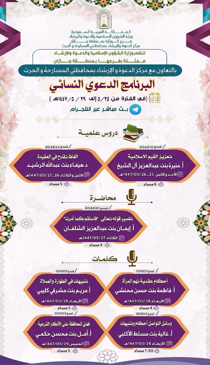 الشؤون الإسلامية بجازان تقيم برنامجًا دعويًا نسائيًا في محافظتي المسارحة والحرثيُقيم فرع وزارة الشؤون الإسلامية والدعوة والإرشاد بمنطقة جازان، ممثلاً بمركز الدعوة والإرشاد بمحافظتي المسارحة والحرث، البرنامج الدعوي النسائي الذي ينطلق مساء اليوم الأحد الخامس والعشرين من شهر جمادى 25/جمادى الأولى/1447 التفاصيل