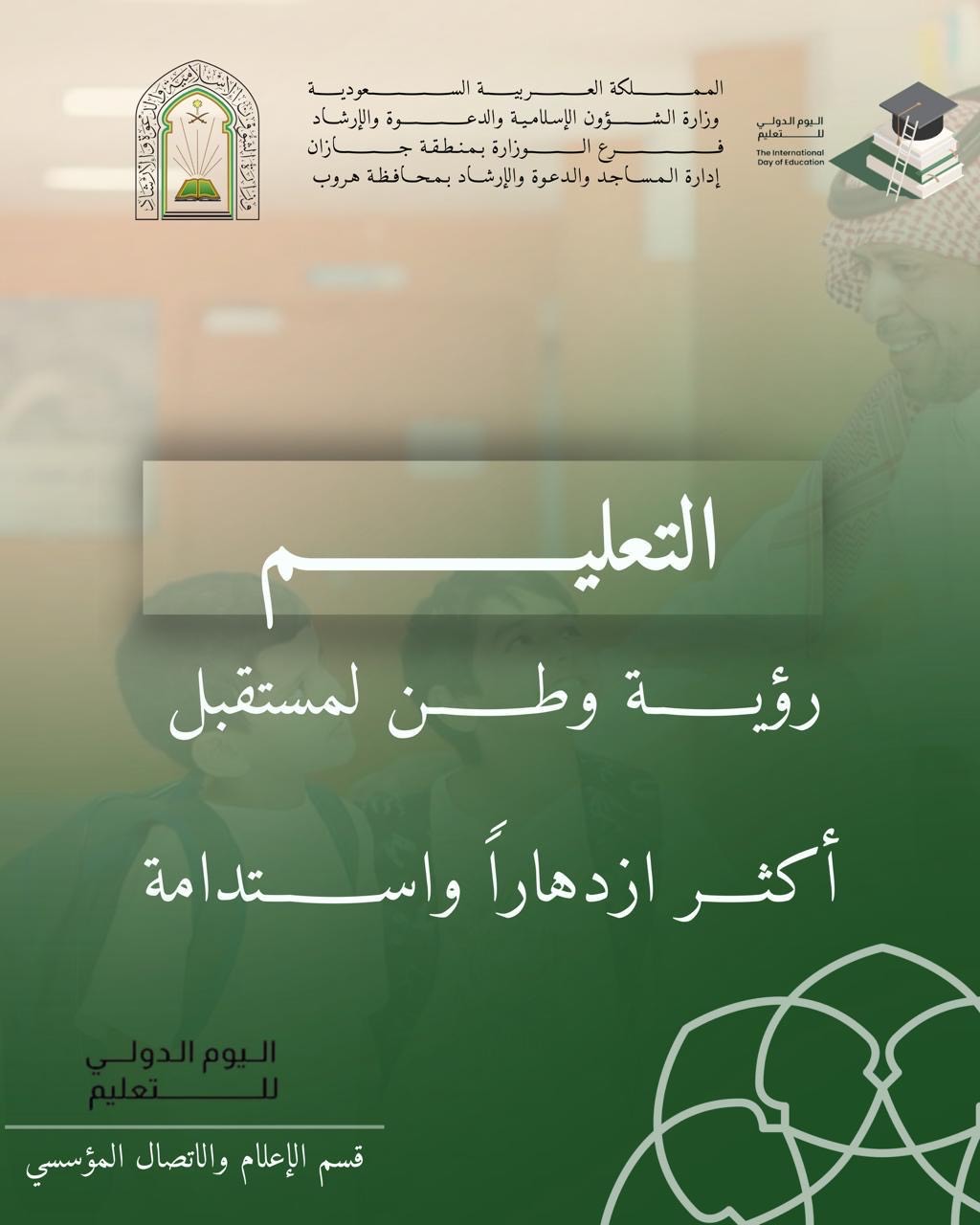 الشؤون الإسلامية بجازان تشارك في اليوم العالمي للتعليم لعام 2026متشارك وزارةُ الشؤون الإسلامية والدعوة والإرشاد، ممثّلةً بفرعها في منطقة جازان، المجتمع في اليوم العالمي للتعليم لعام 2026م، وذلك يوم السبت الخامس من شهر شعبان لعام 1447هـ، الموافق الرابع والعشرين من 06/شعبان/1447 التفاصيل