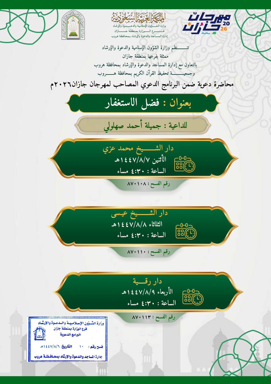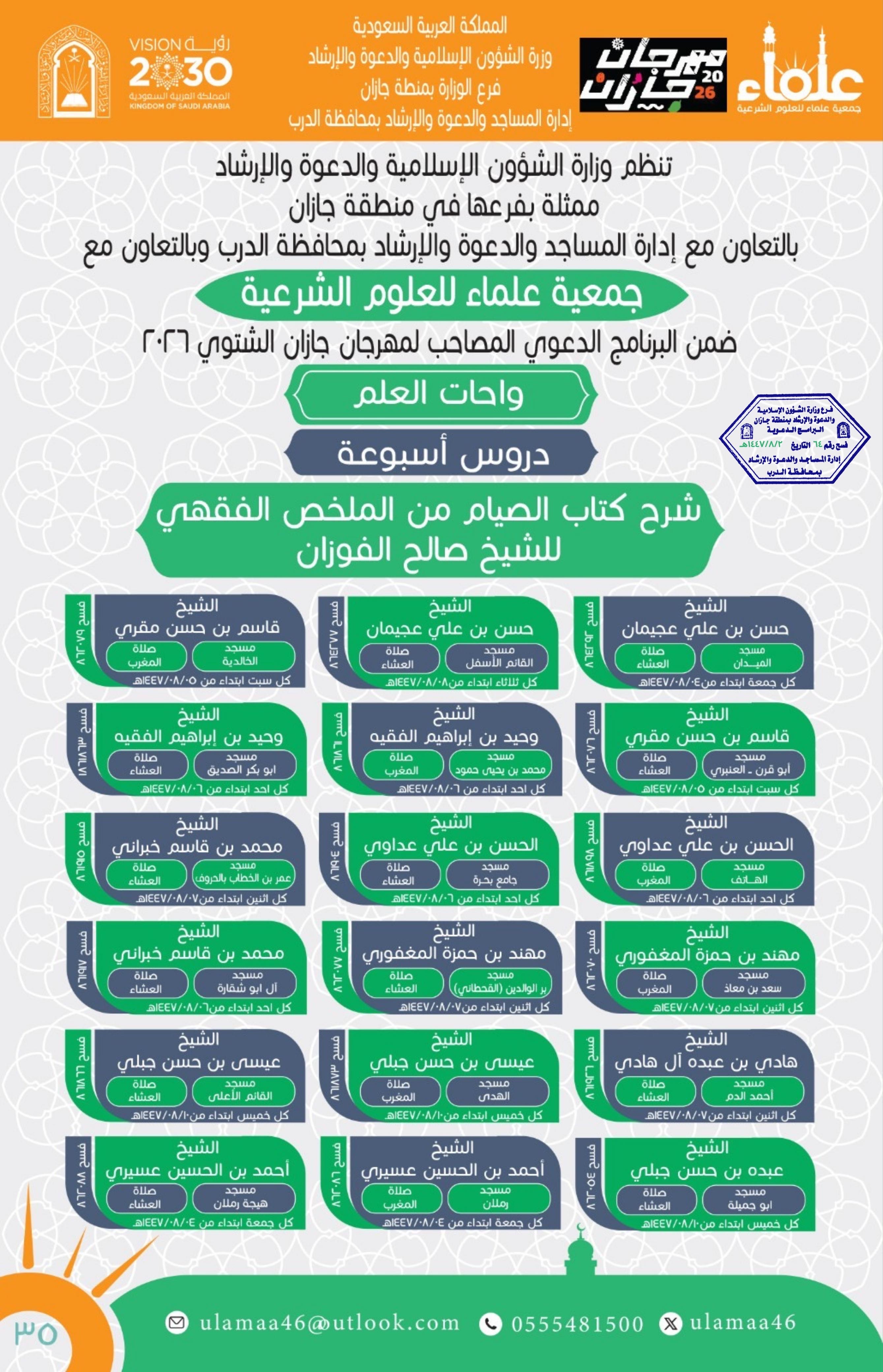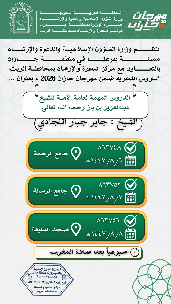 الشؤون الإسلامية بجازان تواصل مناشطها الدعوية بعددٍ من محافظات المنطقةتواصل وزارةُ الشؤون الإسلامية والدعوة والإرشاد، ممثّلةً بفرعها في منطقة جازان، تنفيذَ سلسلةٍ من المناشط الدعوية، ضمن البرنامج الدعوي المصاحب لمهرجان جازان 2026م، وذلك حضورياً في عددٍ من الجوامع والمساجد 07/شعبان/1447 التفاصيل