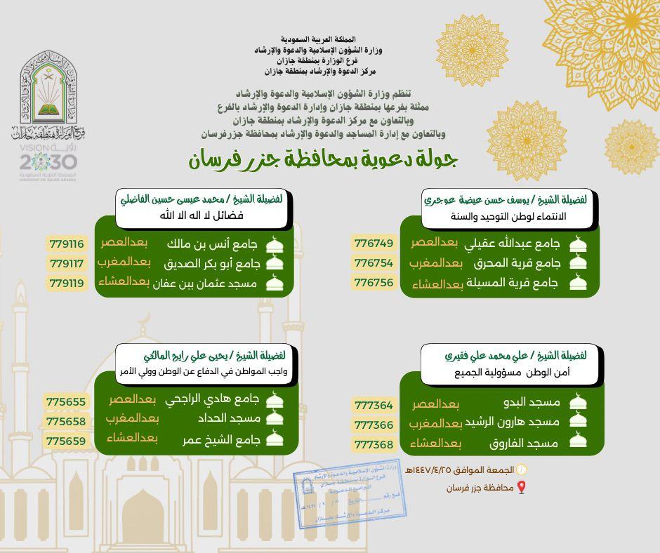 أخبار الشؤون الإسلامية بجازان تنظم جولة دعوية بمحافظة جزر فرسان ينظم فرع وزارة الشؤون الإسلامية والدعوة والإرشاد بمنطقة جازان ممثلاً بادارة المساجد بمحافظة جزر فرسان ومركز دعوة جازان جولة دعوية مساء الجمعة الخامس والعشرون من ربيع الثاني للعام 1447 للهجرة .div وتُنفّذ ... التفاصيل