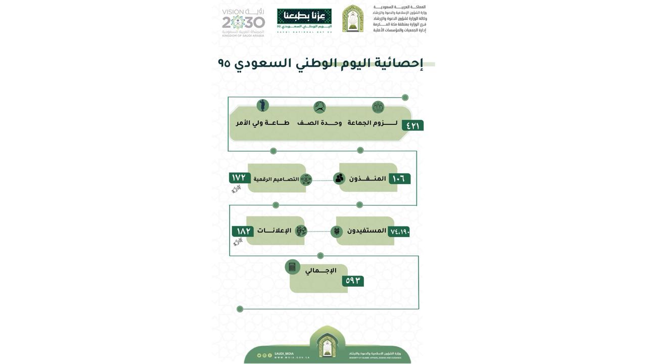 أخبار الشؤون الإسلامية بمكة المكرمة تنفذ 421 كلمة دعوية ضمن الفعاليات المصاحبة لليوم الوطني السعودينفذ فرع وزارة الشؤون الإسلامية والدعوة والإرشاد، ممثلًا بإدارة الجمعيات والمؤسسات الأهلية بالفرع، 421 كلمة ضمن الفعاليات المصاحبة لليوم الوطني السعودي “95” استفاد منها أكثر من (74,190) مستفيد في مختلف ... التفاصيل