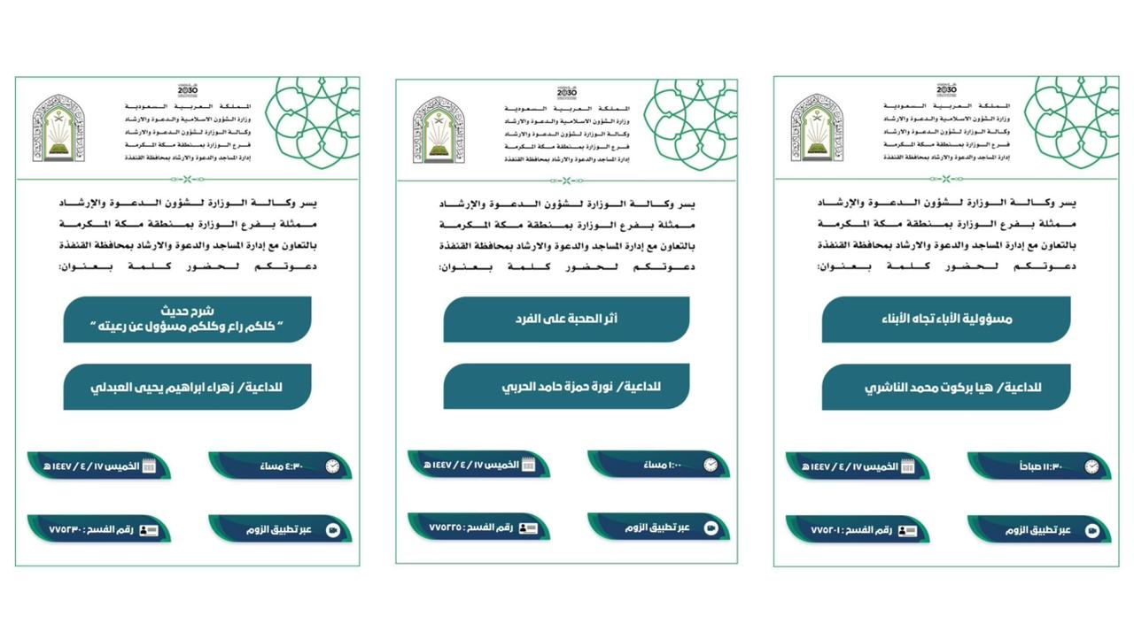 أخبار الشؤون الاسلامية بمكة تنفذ كلمات دعوية بمحافظة القنفذة .ينفذ فرع وزارة الشؤون الإسلامية والدعوة والإرشاد بمنطقة مكة المكرمة ، ممثلاً بإدارة المساجد بمحافظة القنفذة ، خلال الفترة من 15-17 ربيع الآخر 1447 هـ ، سلسلة من الكلمات الدعويه التي تنفذ في المساجد والجوامع ... التفاصيل
