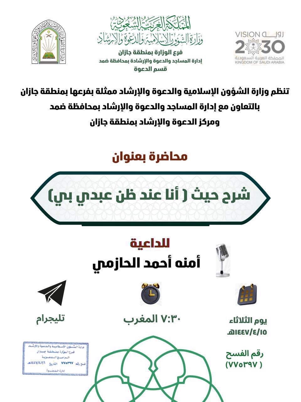 أخبار مناشط دعوية نسائية تنفذها الشؤون الإسلامية في جازان بمدينة جيزان ومحافظة ضمدينفذ فرع وزارة الشؤون الإسلامية والدعوة والإرشاد في منطقة جازان ممثلاً بمركز الدعوة بمدينة جيزان يوم الثلاثاء الخامس عشر من شهر ربيع الثاني لعام 1447هـ، محاضرة دعوية نسائية في مسجد زيد بن ثابت، تتناول ... التفاصيل