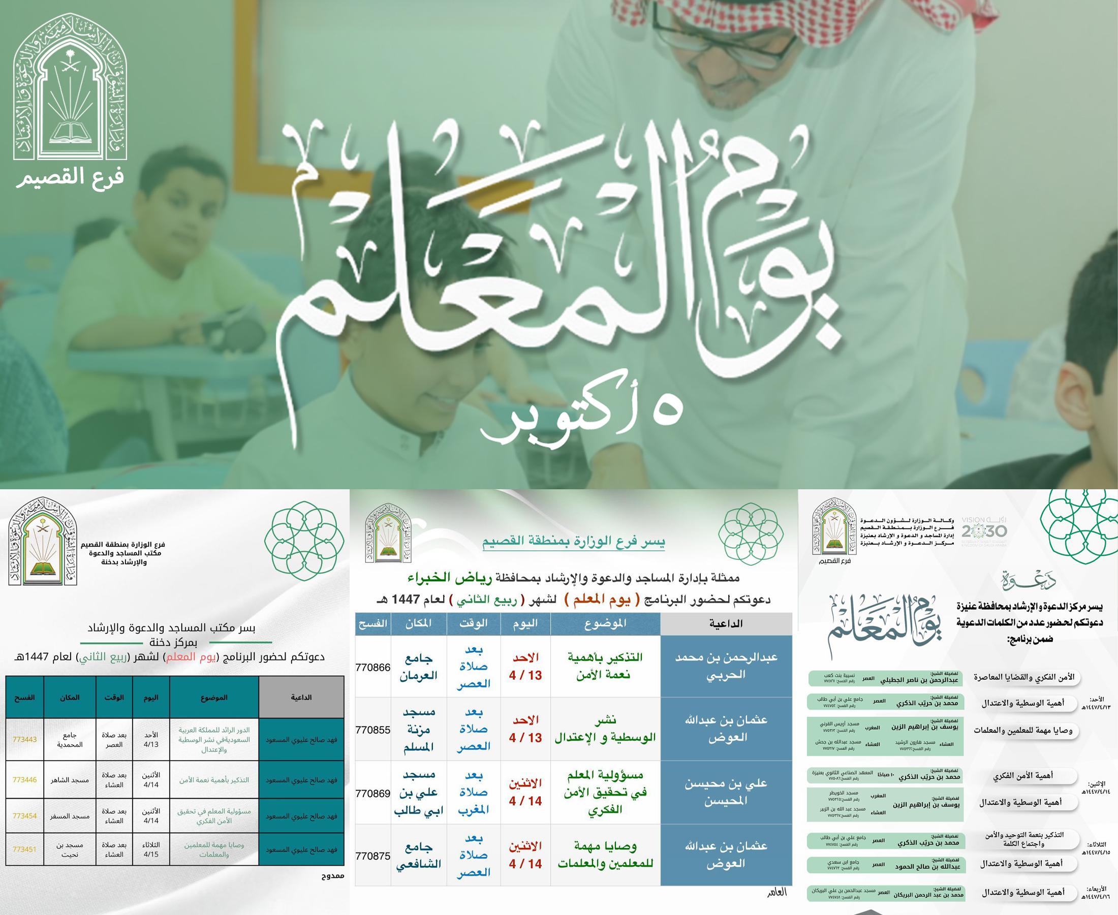 أخبار الشؤون الإسلامية بالقصيم تنفذ برنامجاً دعوياً بمناسبة اليوم العالمي للمعلمشارك فرع وزارة الشؤون الإسلامية والدعوة والإرشاد بمنطقة القصيم، برنامجاً دعوياً توعوياً ابتداء يوم الأحد الثالث عشر وينتهي يوم الثلاثاء الخامس عشر من شهر ربيع الآخر في عددٍ من الجوامع والمساجد ... التفاصيل