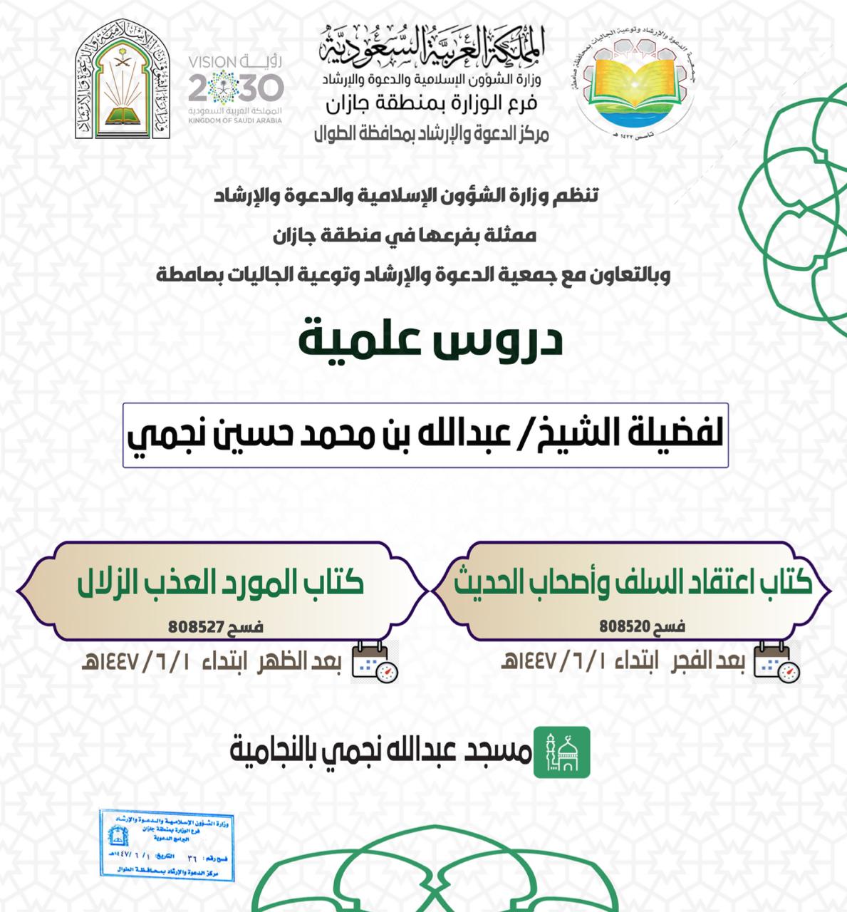 أخبار دروس علمية ومحاضرتان دعويتان تنظّمها الشؤون الإسلامية بجازان في صامطة وفيفا ينظّم فرع وزارة الشؤون الإسلامية والدعوة والإرشاد بمنطقة جازان، وبالتعاون مع جمعيتي الدعوة والإرشاد وتوعية الجاليات في محافظتي صامطة وفيفا، خلال يومي السبت والأربعاء 1 – 5 جمادى الآخرة لعام 1447هـ، ... التفاصيل