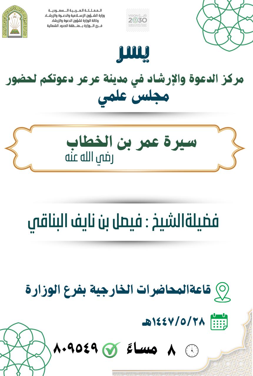 أخبار الشؤون الإسلامية في الحدود الشمالية تقيم مجلسًا علميًا عن "سيرة عمر بن الخطاب" في عرعرأقام فرعُ وزارة الشؤون الإسلامية والدعوة والإرشاد بمنطقة الحدود الشمالية، ممثلاً بمركز الدعوة والإرشاد بمدينة عرعر، مجلسًا علميًا بعنوان: "سيرة عمر بن الخطاب رضي الله عنه"، وذلك مساء ... التفاصيل