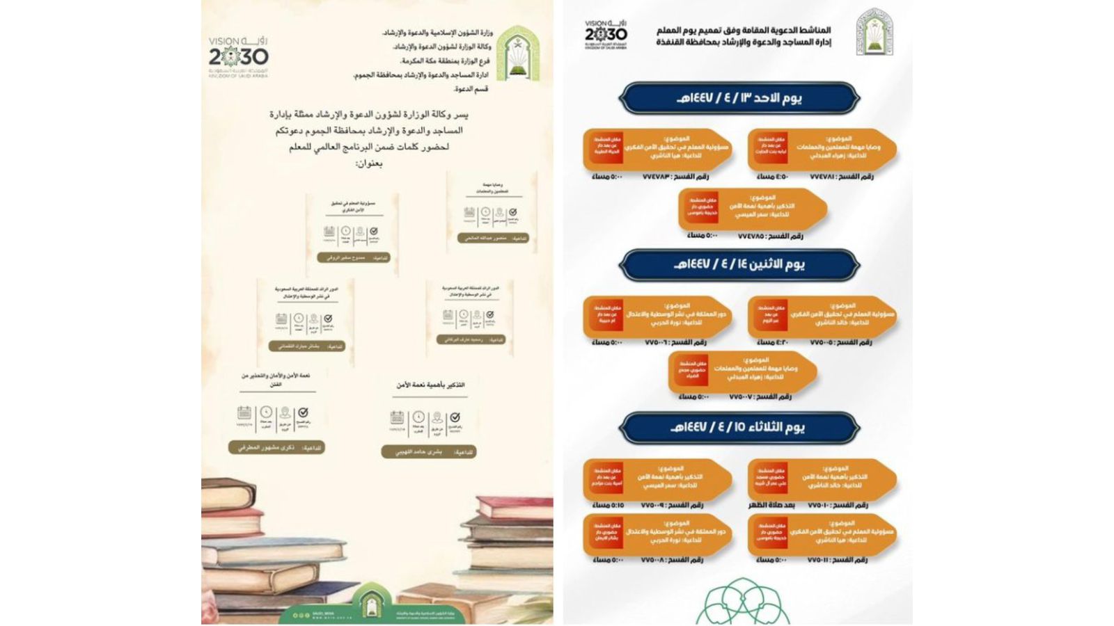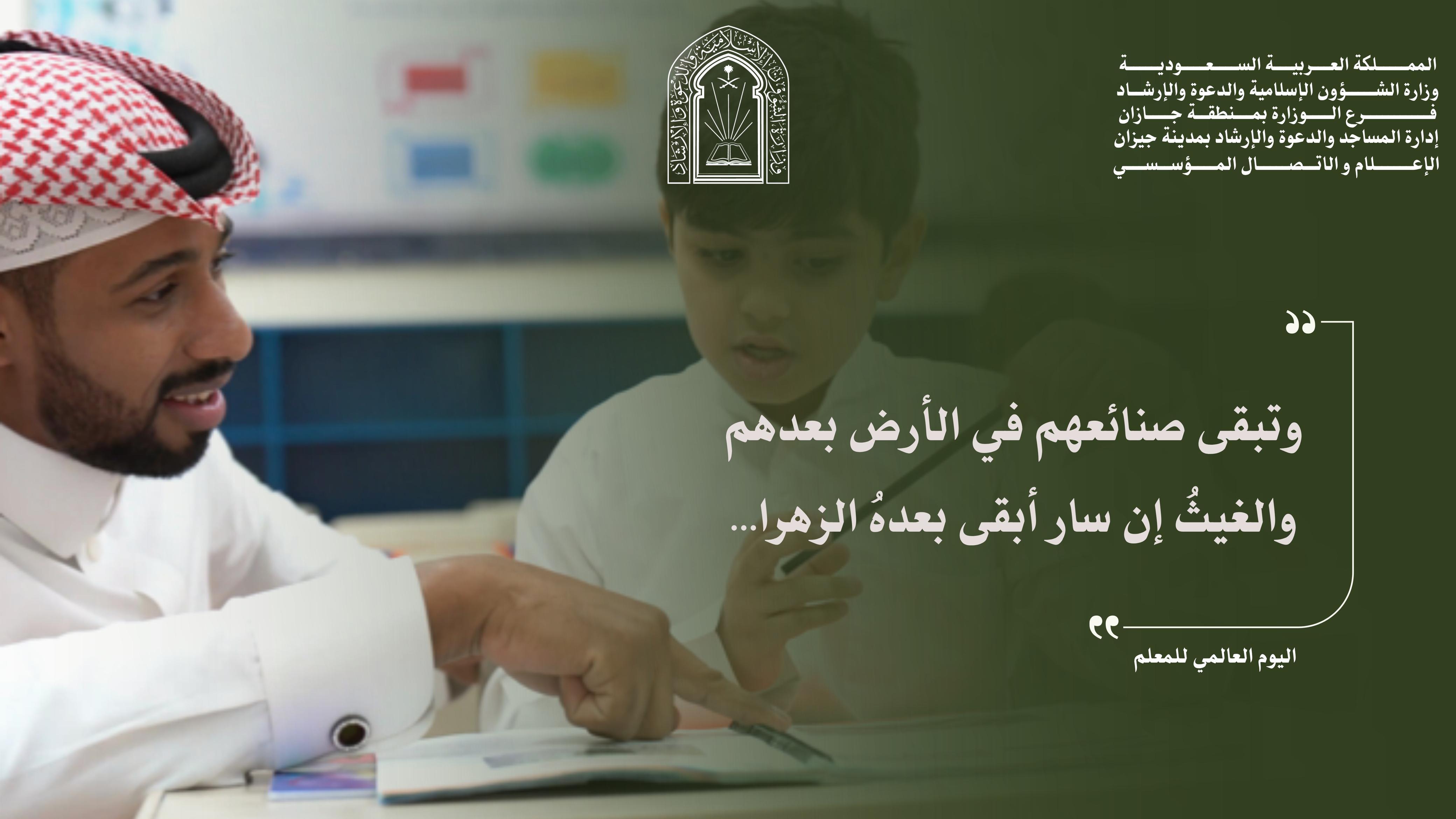 أخبار فرع الشؤون الإسلامية بجازان يشارك في اليوم العالمي للمعلم شارك فرع وزارة الشؤون الإسلامية والدعوة والإرشاد بمنطقة جازان، في فعاليات اليوم العالمي للمعلم الذي يوافق الخامس من شهر أكتوبر من كل عام، وذلك من خلال تصميم ونشر عددٍ من التصاميم التوعوية عبر منصات ... التفاصيل