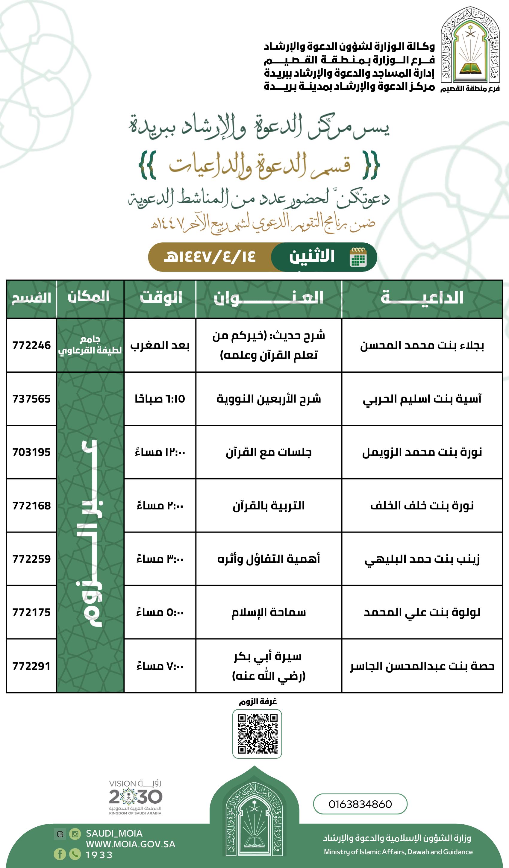 أخبار الشؤون الإسلامية بالقصيم تنفذ عدداً من المناشط الدعوية النسائيةنفذ فرع وزارة الشؤون الإسلامية والدعوة والإرشاد بمنطقة القصيم، ممثلاً بمركز الدعوة والإرشاد بمدينة بريدة، تنفيذ عددٍ من المناشط الدعوية النسائية، ليوم الاثنين 14 ربيع الآخر 1447هـ مجموعة من المحاضرات ... التفاصيل