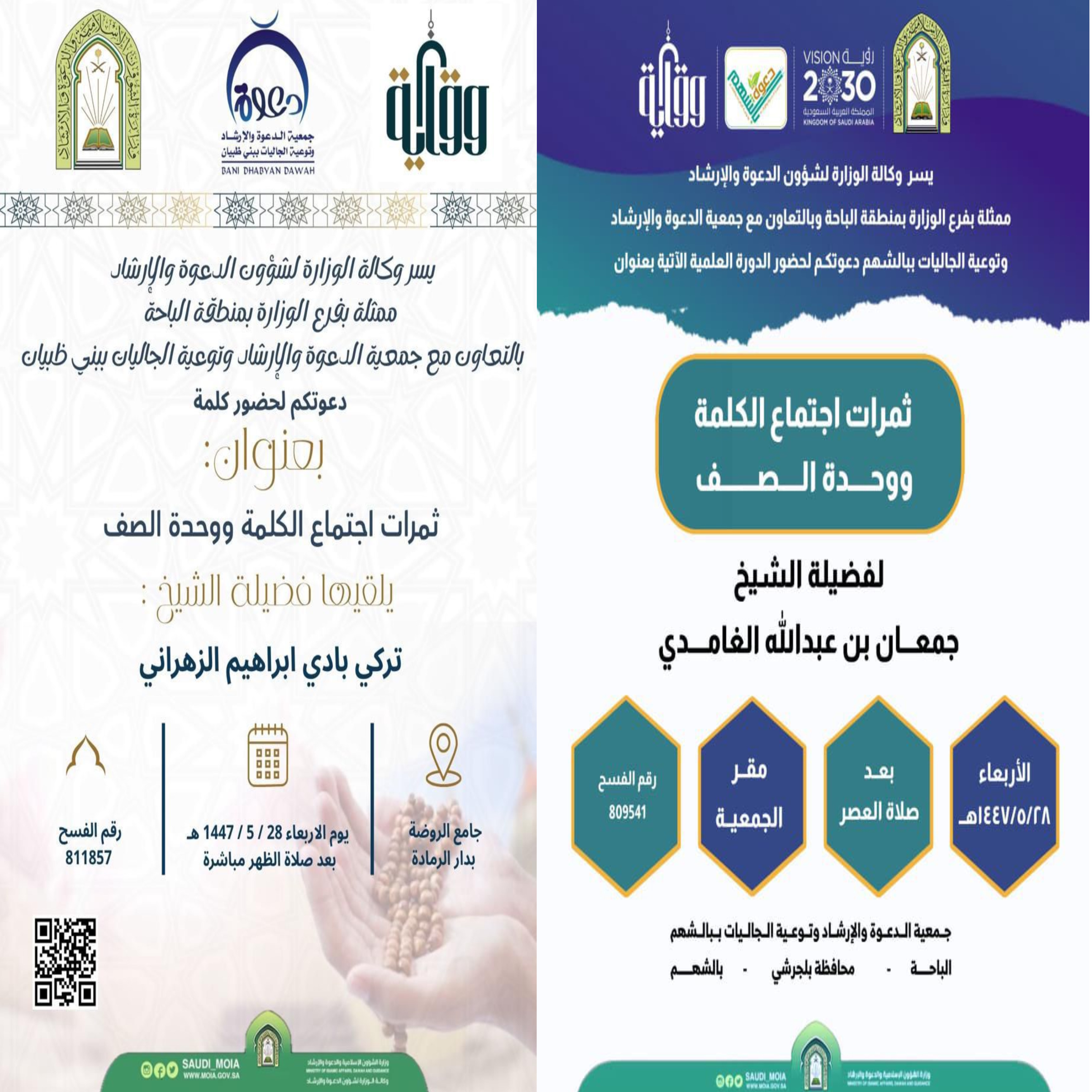 أخبار الشؤون الإسلامية بالباحة تواصل تنفيذ مناشطها الدعوية بكلمة بعنوان "ثمرات اجتماع الكلمة ووحدة الصف"يواصل فرعُ وزارة الشؤون الإسلامية والدعوة والإرشاد بمنطقة الباحة، وبالتعاون مع جمعيتي الدعوة والإرشاد في بالشهم وبني ظبيان بمحافظة بلجرشي، تنفيذ مناشطه الدعوية بكلمةٍ بعنوان "ثمرات اجتماع الكلمة ... التفاصيل