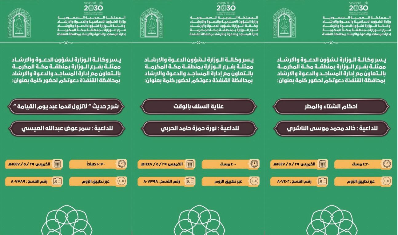 أخبار الشؤون الإسلامية بمكة المكرمة تنفذ 1091 منشطًا دعويًانفذ فرع وزارة الشؤون الإسلامية والدعوة والإرشاد بمنطقة مكة المكرمة، خلال الفترة من 23 اكتوبر الى 21 نوفمبر 2025م، (1091) منشطًا دعويًا شملت مختلف محافظات المنطقة. divوقد تنوعت هذه المناشط بين البرامج ... التفاصيل