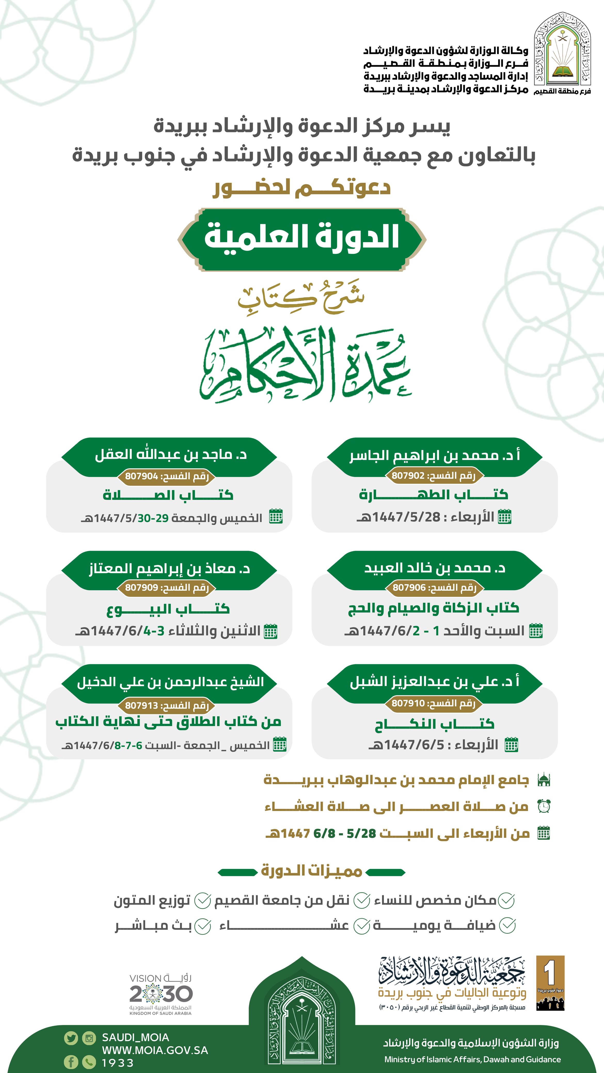 أخبار الشؤون الإسلامية بالقصيم تطلق الدورة العلمية لشرح كتاب عمدة الأحكام في جامع الإمام محمد بن عبدالوهاب ببريدةأطلق فرع وزارة الشؤون الإسلامية والدعوة والإرشاد بمنطقة القصيم، ممثلاً بمركز الدعوة والإرشاد بمدينة بريدة، الدورة العلمية لشرح كتاب عمدة الأحكام، وذلك اعتبارًا من اليوم الأربعاء الموافق 28 جمادى الأولى ... التفاصيل