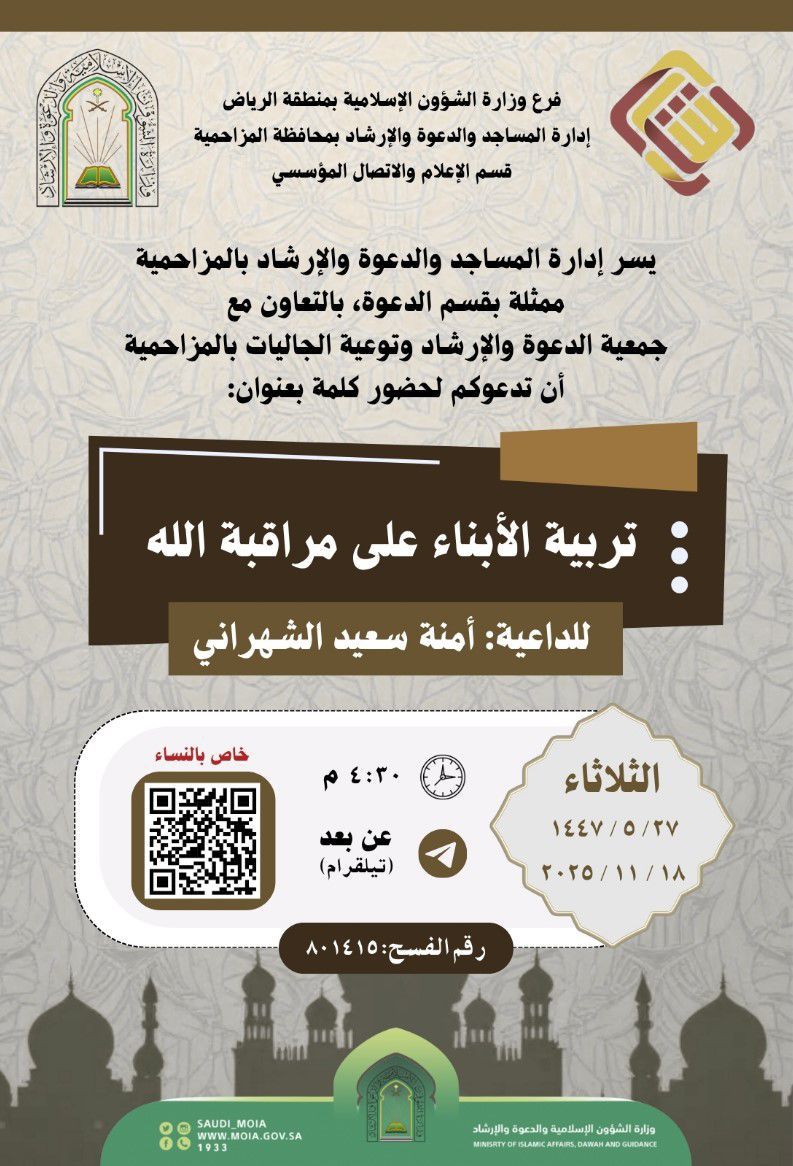 أخبار فرع الشؤون الإسلامية بالرياض ينفذ محاضرة دعوية نسائية بمحافظة المزاحميةنفذ فرع وزارة الشؤون الإسلامية والدعوة والإرشاد بمنطقة الرياض، ممثلاً بإدارة المساجد والدعوة والإرشاد بالمزاحمية، يوم الثلاثاء السابع والعشرين من شهر جمادى الأولى 1447هـ، محاضرة دعوية نسائية بعنوان: ... التفاصيل