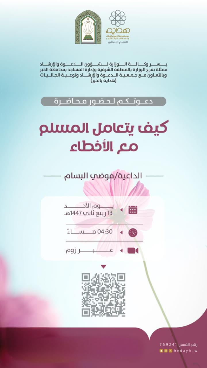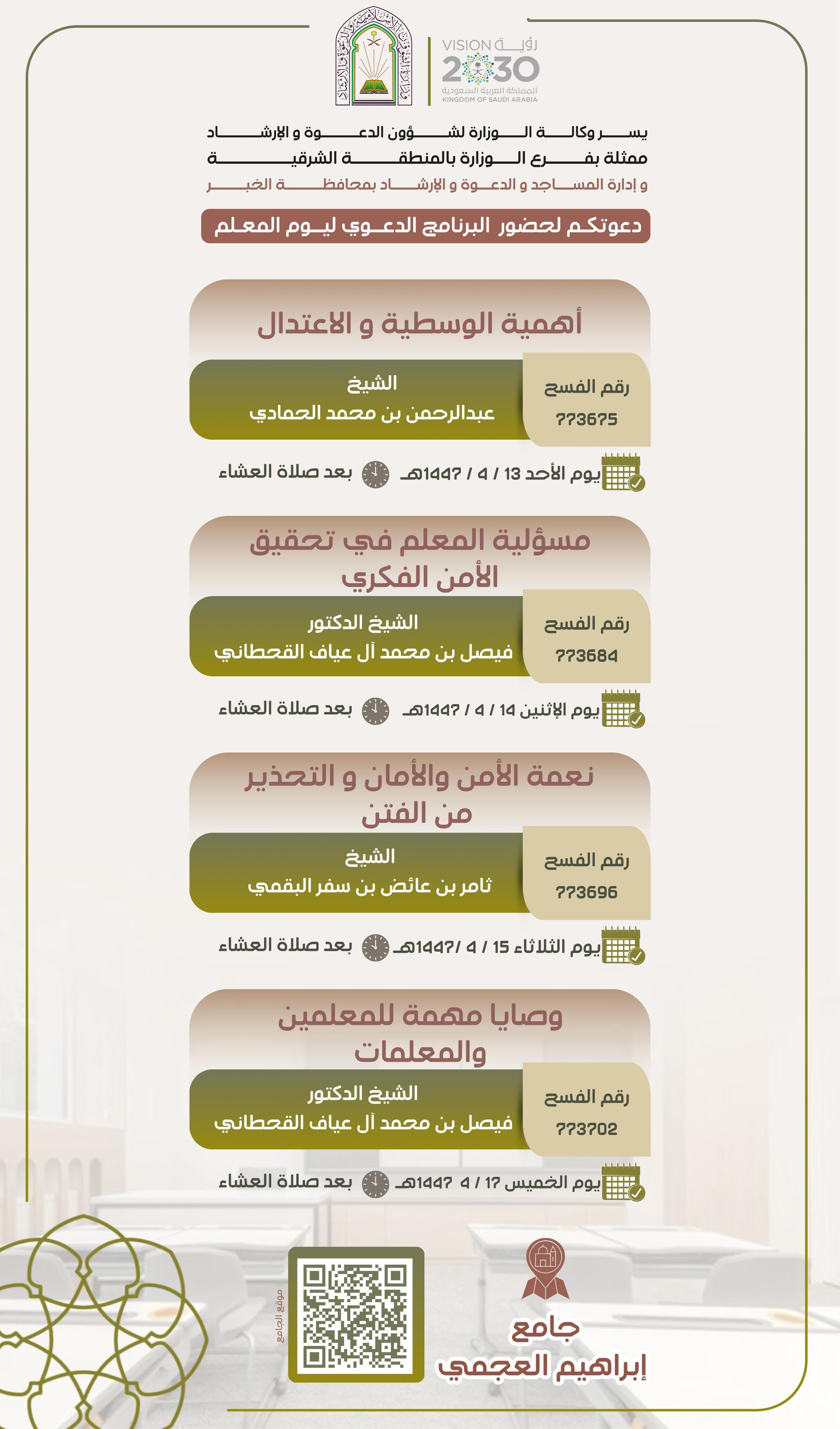 أخبار فرع الشؤون الإسلامية بالشرقية ينفذ برنامجًا دعويًا ليوم المعلّم بمحافظة الخبرينفذ فرع وزارة الشؤون الإسلامية والدعوة والإرشاد بالمنطقة الشرقية، ممثلاً بإدارة المساجد والدعوة والإرشاد بمحافظة الخبر، يوم الأحد الثالث عشر من شهر ربيع الآخر 1447هـ، ولمدة خمسة أيام برنامجًا دعويًا ... التفاصيل