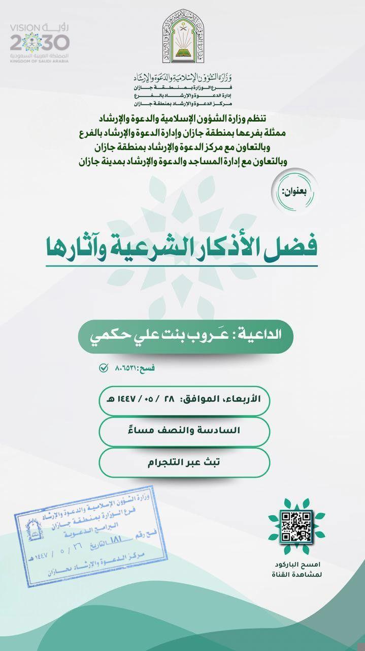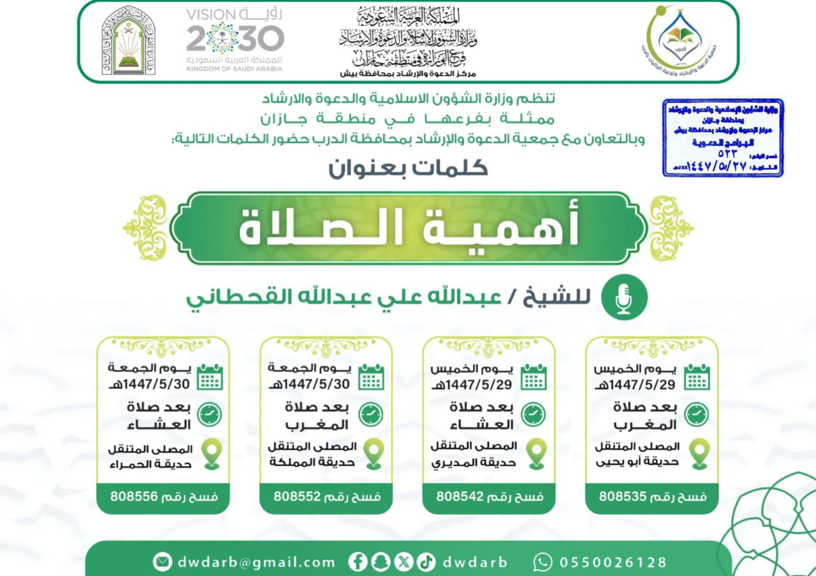أخبار الشؤون الإسلاميه بمكة ينظم عدد من الكلمات الدعوية بمحافظة العرضيات .ينظم فرع وزارة الشؤون الإسلامية والدعوة والإرشاد بمنطقة مكة المكرمة، ممثلاً بإدارة المساجد والدعوة والإرشاد بمحافظة العرضيات ، خلال الفترة من 28- 30 من شهر جمادى الأولى لعام 1447 هـ ، سلسلة من الكلمات ... التفاصيل
