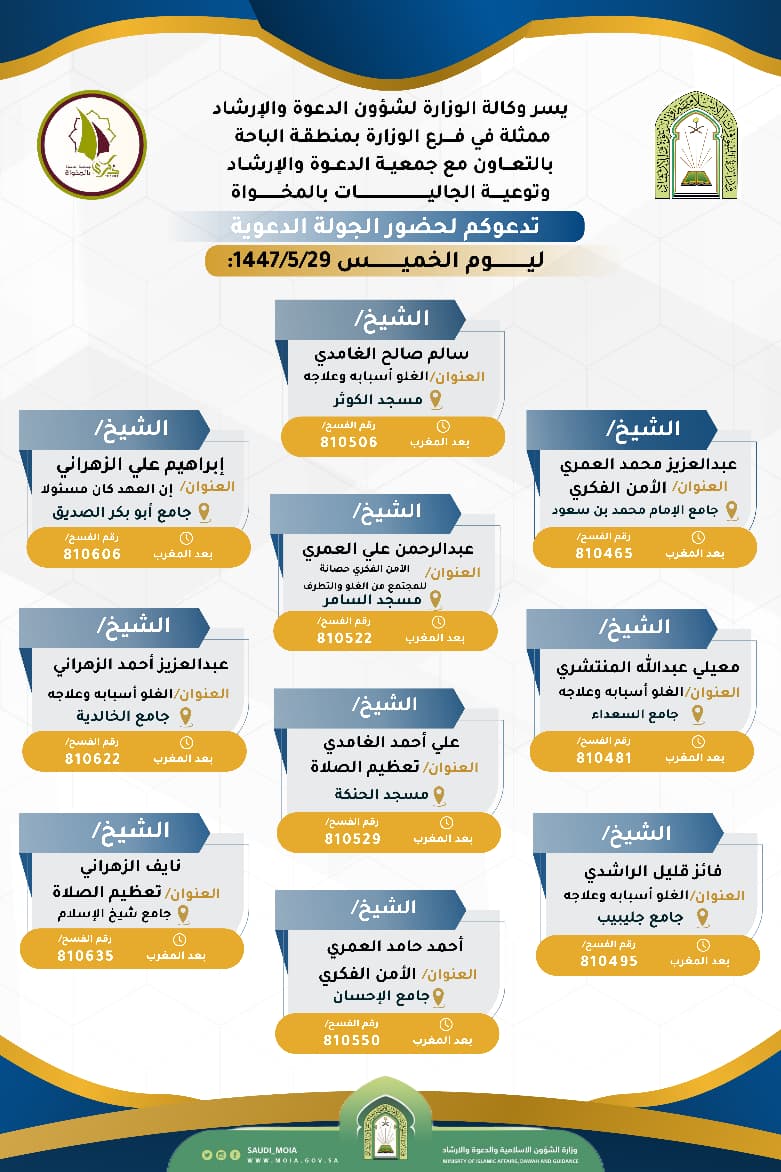 أخبار الشؤون الإسلامية بالباحة تُقيم دروسًا وكلمات دعوية في عددٍ من المحافظاتيُقيم فرع وزارة الشؤون الإسلامية والدعوة والإرشاد بمنطقة الباحة ومحافظاتها، وبالتعاون مع جمعيات الدعوة والإرشاد وتوعية الجاليات في محافظات بالشهم، وقلوة، ووراخ، وبلجرشي، وبني سار، عددًا من الدروس والكلمات ... التفاصيل