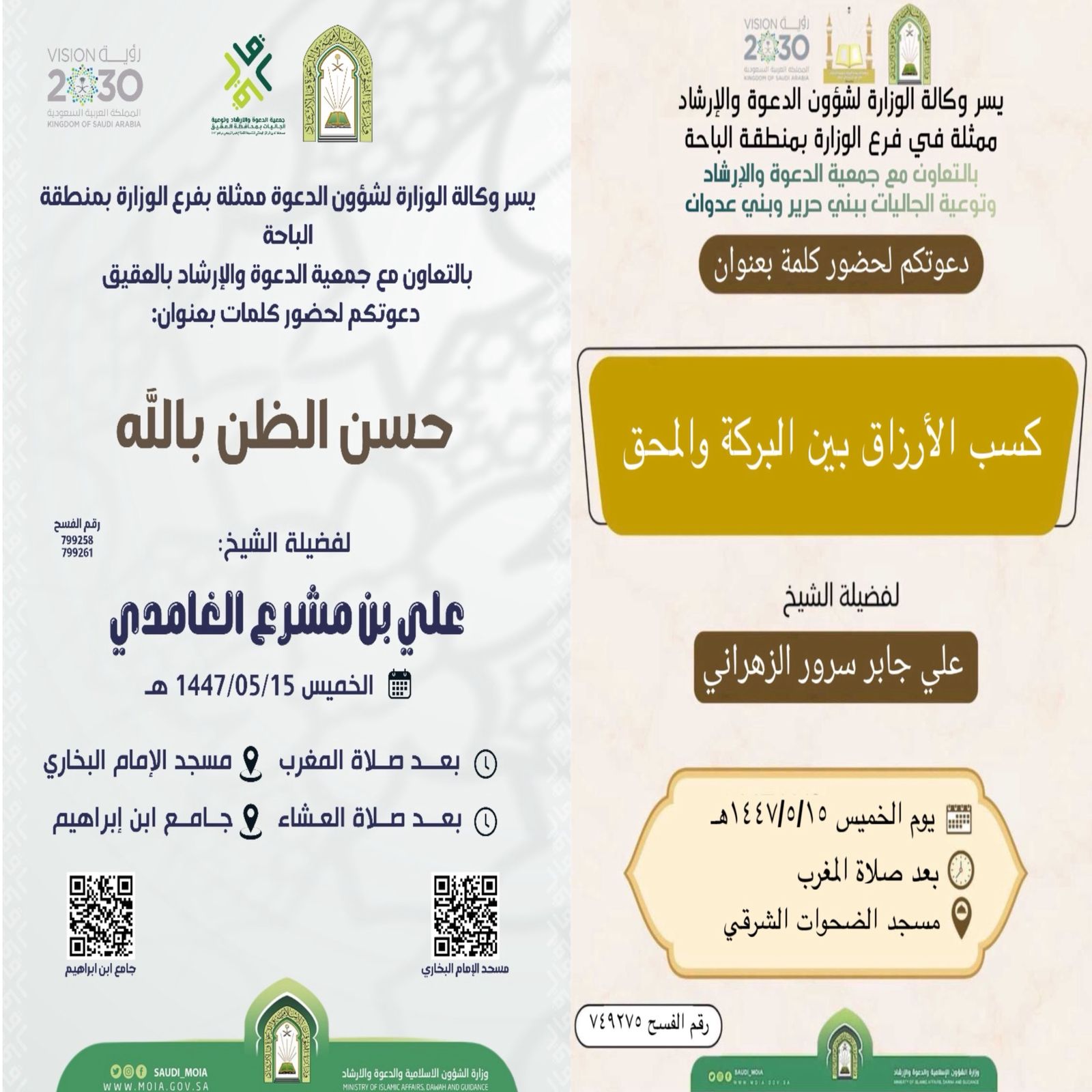 الشؤون الإسلامية بالباحة تنظم كلمتين دعويتين في بني عدوان والعقيقMOIA18/جمادى الأولى/1447MOIAالإدارة العامة للإعلام والإتصال المؤسسيينظّم فرع وزارة الشؤون الإسلامية والدعوة والإرشاد بمنطقة الباحة، وبالتعاون مع جمعيات الدعوة والإرشاد وتوعية الجاليات في العقيق وبني حرير وبني عدوان، اليوم الخميس الخامس عشر من شهر جمادى الأولى لعام 1447هـ، كلمتين دعويتين تستهدفان تعزيز الوعي الشرعي وترسيخ القيم الإسلامية في المجتمع.ففي بني حرير وبني عدوان، تُقام الكلمة الأولى بعنوان "كسب الأرزاق بين البركة والمحق" بمسجد الضحوات الشرقي بعد صلاة المغرب. فيما تُقام في محافظة العقيق الكلمة الثانية بعنوان "حسن الظن بالله" بمسجد الإمام البخاري بعد صلاة المغرب، وبجامع ابن إبراهيم بعد صلاة العشاء.وتأتي هذه الكلمات الدعوية في إطار المناشط التي ينفّذها فرع الوزارة بالمنطقة لنشر العلم الشرعي، وتوعية المجتمع بأمور دينهم ودنياهم، وتحقيق رسالة الوزارة في الدعوة إلى الله بالحكمة والموعظة الحسنة.
