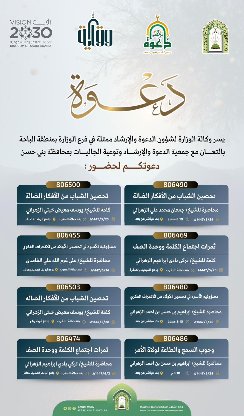الشؤون الإسلامية بالباحة تواصل تنفيذ سلسلة محاضرات دعوية ضمن برنامج "وقاية"في محافظة بني حسنMOIA27/جمادى الأولى/1447MOIAالإدارة العامة للإعلام والإتصال المؤسسيتواصل وزارة الشؤون الإسلامية بمنطقة الباحة، بالتعاون مع جمعية الدعوة بمحافظة بني حسن، تنفيذ سلسلة من المحاضرات الدعوية خلال الفترة من يوم السبت 24 جمادى الأولى وحتى يوم الأحد 2 جمادى الآخرة لعام 1447هـ، وذلك ضمن برنامج "وقاية" الهادف إلى تعزيز الأمن الفكري وترسيخ منهج الوسطية والاعتدال.وتُقام هذه المحاضرات في عددٍ من الجوامع والمساجد بالمحافظة، كما تُبث عبر المنصات التقنية، بمشاركة نخبة من الدعاة الذين يتناولون موضوعات شرعية وفكرية متنوعة، من أبرزها: تحصين الشباب من الأفكار الضالة، ومسؤولية الأسرة في حماية الأبناء من الانحراف الفكري، وثمرات اجتماع الكلمة ووحدة الصف، ووجوب السمع والطاعة لولاة الأمر.وتأتي هذه المحاضرات ضمن جهود الوزارة في نشر الوعي الشرعي والفكري، وتعزيز الحصانة الفكرية للمجتمع، وحمايته من الأفكار المنحرفة، تحقيقًا لمستهدفات برنامج "وقاية".