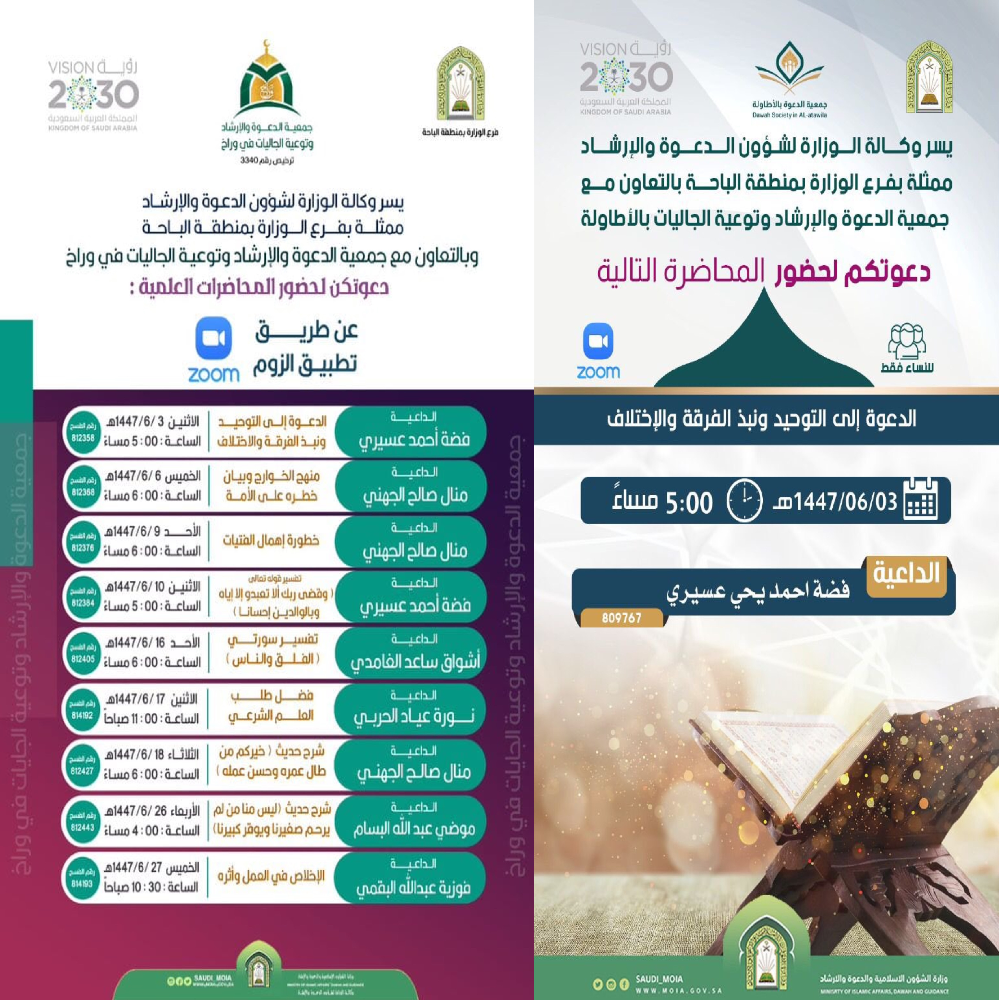 الشؤون الإسلامية بالباحة تنفّذ برنامجًا علميًا نسائيًا عبر منصة الزومMOIA03/جمادى الثانية/1447MOIAالإدارة العامة للإعلام والإتصال المؤسسيينفّذ فرع وزارة الشؤون الإسلامية والدعوة والإرشاد بمنطقة الباحة، بالتعاون مع جمعيتي الدعوة والإرشاد وتوعية الجاليات في الأطاولة ووراخ، برنامجًا علميًا نسائيًا عن بعد عبر منصة زووم، يتضمن سلسلة من المحاضرات والدروس العلمية المخصصة للنساء، والتي تنطلق اليوم الاثنين الثالث من شهر جمادى الآخرة، وتستمر حتى السابع والعشرين من الشهر نفسه لعام 1447هـ.وتتناول هذه المحاضرات موضوعات إيمانية وتربوية متعددة، من أبرزها: الدعوة إلى التوحيد ونبذ الفرقة والاختلاف، منهج الخوارج وخطره على الأمة، خطورة إهمال الفتيات، فضل طلب العلم الشرعي، الإخلاص في العمل وأثره، إلى جانب دروس في تفسير قوله تعالى: (وقضى ربك ألا تعبدوا إلا إياه وبالوالدين إحسانا) ، وتفسير سورتي الفلق والناس، وشرح حديث النبي: خيركم من طال عمره وحسن عمله.ويسهم هذا البرنامج في تعزيز الاستفادة من التقنيات الحديثة في إيصال البرامج الدعوية والعلمية للنساء، بما يتيح لهن اكتساب المعرفة الشرعية ورفع مستوى الوعي الديني في المجتمع.