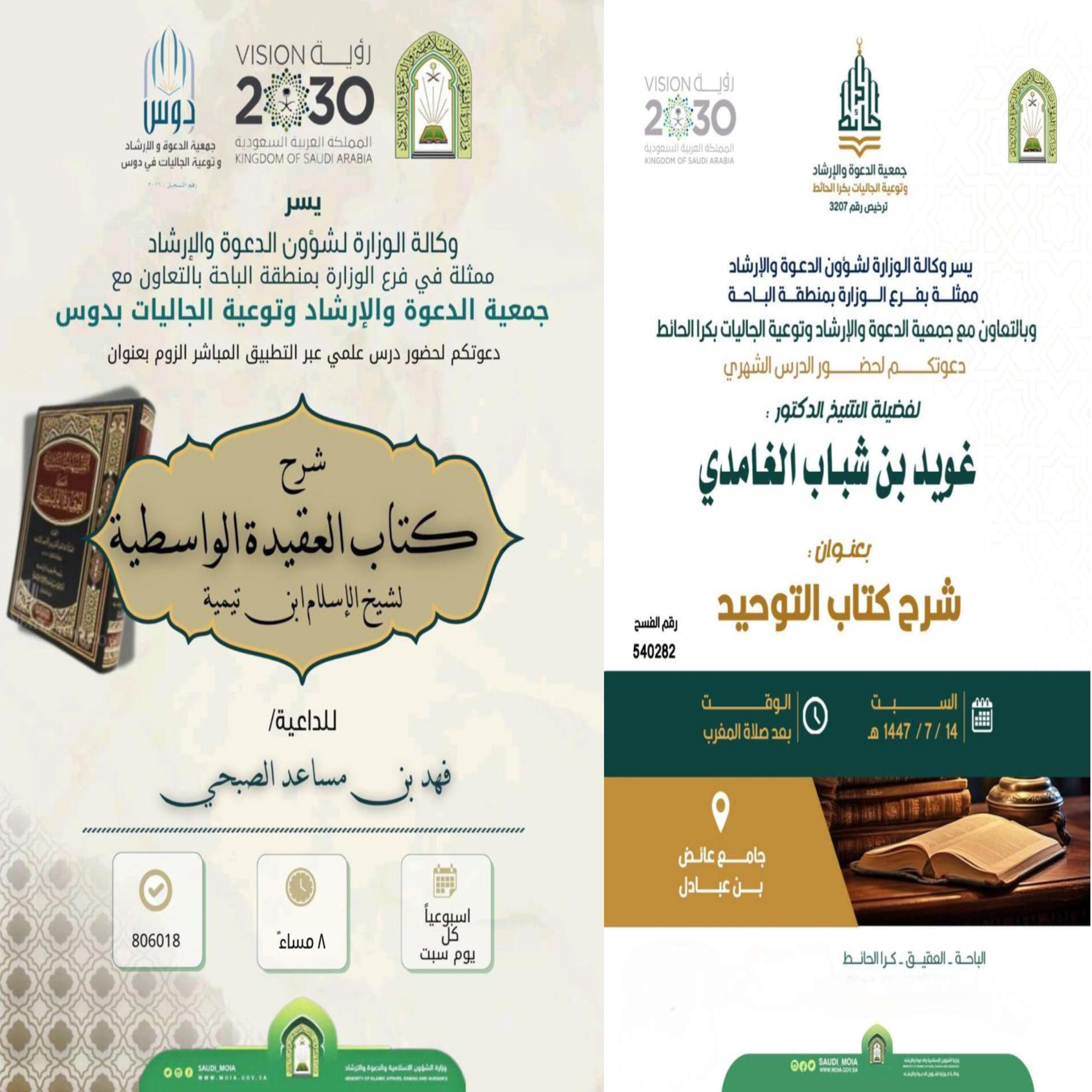 ضمن برامجها الدعوية.. الشؤون الإسلامية بالباحة تُقيم درسين علميين في دوس وبكرا الحائطMOIA15/رجب/1447MOIAالإدارة العامة للإعلام والإتصال المؤسسيأقامت وزارة الشؤون الإسلامية والدعوة والإرشاد، ممثّلةً بفرعها في منطقة الباحة، وبالتعاون مع جمعيتي الدعوة والإرشاد وتوعية الجاليات في دوس وبكرا الحائط، يوم أمس السبت الرابع عشر من شهر رجب لعام 1447هـ، درسين علميين.حيث أُقيم الدرس الأول في مركز دوس بعنوان "شرح كتاب العقيدة الواسطية لشيخ الإسلام ابن تيمية" عبر منصة الزووم" في تمام الساعة الثامنة مساءً، فيما أُقيم الدرس الثاني في مركز كرا الحائط بعنوان "شرح كتاب التوحيد" في جامع عائض بن عبادل بعد صلاة المغرب.وتأتي هذه الدروس ضمن جهود فرع الوزارة بمنطقة الباحة في تنفيذ برامجه الدعوية والعلمية، الهادفة إلى نشر العلم الشرعي، وترسيخ القيم الإسلامية، وتعزيز الوعي الديني لدى أفراد المجتمع.