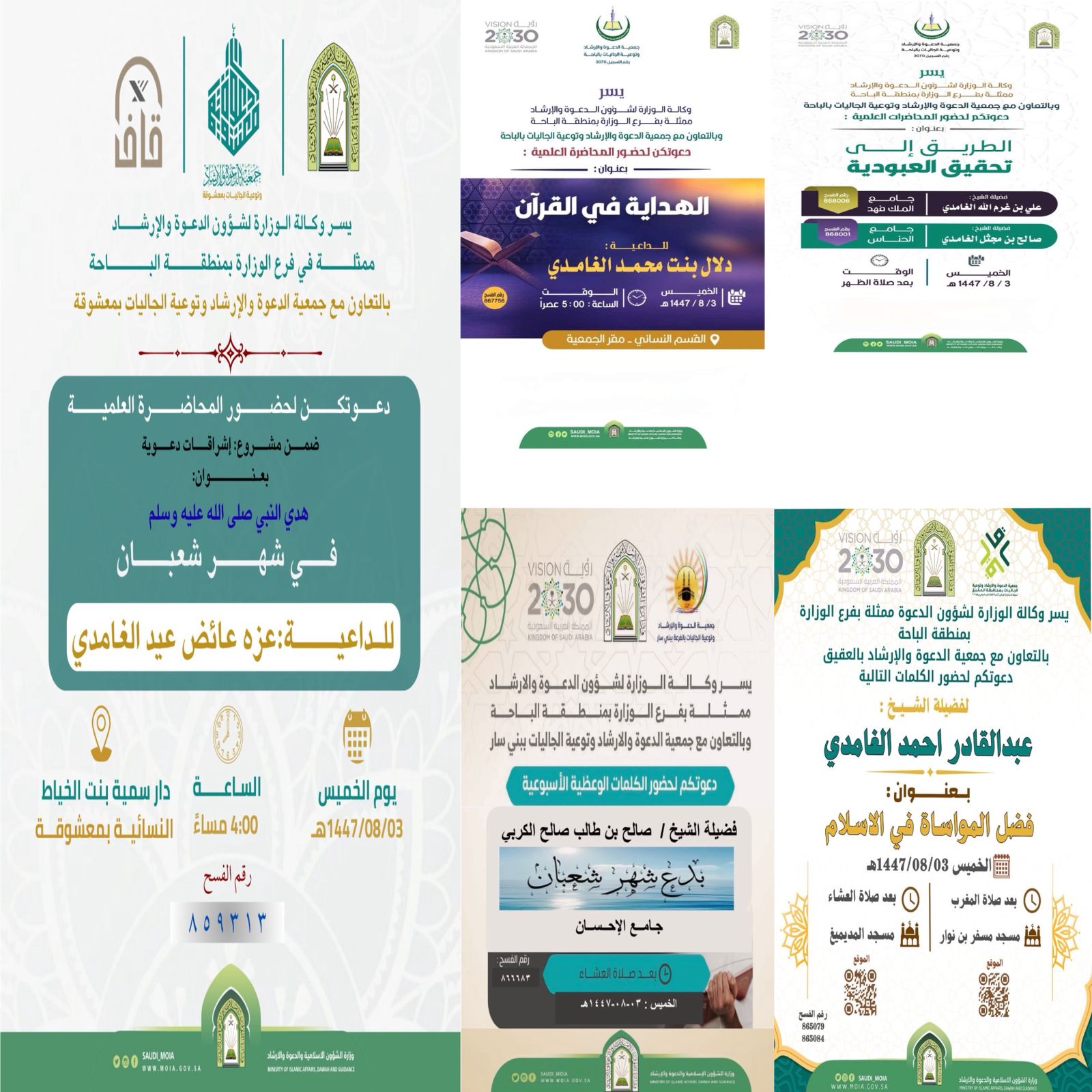 فرع الشؤون الإسلامية بالباحة ينفّذ سلسلة مناشط دعوية متنوعةMOIA06/شعبان/1447MOIAالإدارة العامة للإعلام والإتصال المؤسسي نفّذت وزارة الشؤون الإسلامية والدعوة والإرشاد ممثّلةً بفرعها بمنطقة الباحة، وبالتعاون مع جمعيات الدعوة والإرشاد بمدينة الباحة ومحافظات بني سار ومعشوقة والعقيق، يوم الخميس الثالث من شهر شعبان لعام 1447هـ، سلسلةً من المناشط الدعوية المتنوعة، وذلك ضمن جهوده المتواصلة في تعزيز الوعي الشرعي وترسيخ القيم الإسلامية في المجتمع.وشملت هذه المناشط عددًا من الموضوعات الإيمانية والتوعوية، من أبرزها: الطريق إلى تحقيق العبودية و الهداية في القرآن و بدع شهر شعبان و هدي النبي ﷺ في شهر شعبان وفضل المواساة في الإسلام.وتأتي هذه المناشط ضمن البرامج الدعوية التي ينفّذها فرع الوزارة بالباحة؛ لنشر العلم الشرعي، وتوعية المجتمع بأمور دينهم ودنياهم، وتحقيق رسالة الوزارة في الدعوة إلى الله بالحكمة والموعظة الحسنة.