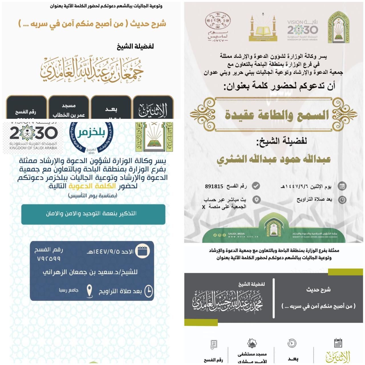 كلمات دعوية تنظّمها الشؤون الإسلامية بالباحة في بني حسن وبني عدوان تُنفذ وزارة الشؤون الإسلامية والدعوة والإرشاد ممثلة بفرعها في الباحة، وبالتعاون مع جمعيات الدعوة والإرشاد بالمنطقة و محفظاتها , اليوم الأربعاء الأول من شهر رمضان , لعام 1447هـ،كلمات توعوية وذلك ضمن جهودها 01/رمضان/1447 التفاصيل