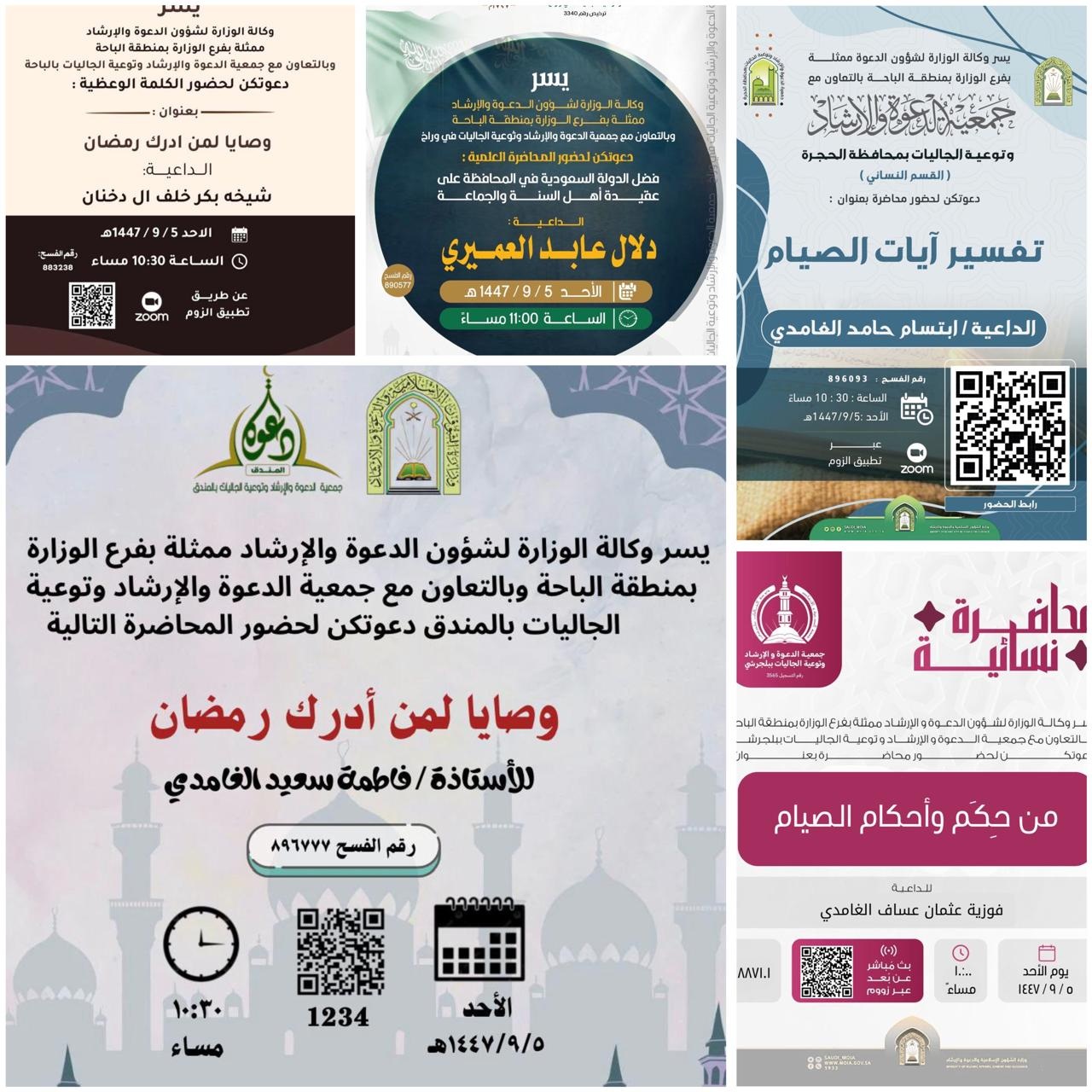 الشؤون الإسلامية بالباحة تُنفّذ برنامجًا دعويًا خلال شهر رمضان تٌنفذ وزارةُ الشؤون الإسلامية والدعوة والإرشاد، ممثّلةً بفرعها في منطقة الباحة، وبالتعاون مع جمعية الدعوة والإرشاد وتوعية الجاليات بوراخ، برنامجًا دعويًا نسائياً خلال شهر رمضان عبر منصة الزوم ، ابتداءً 01/رمضان/1447 التفاصيل