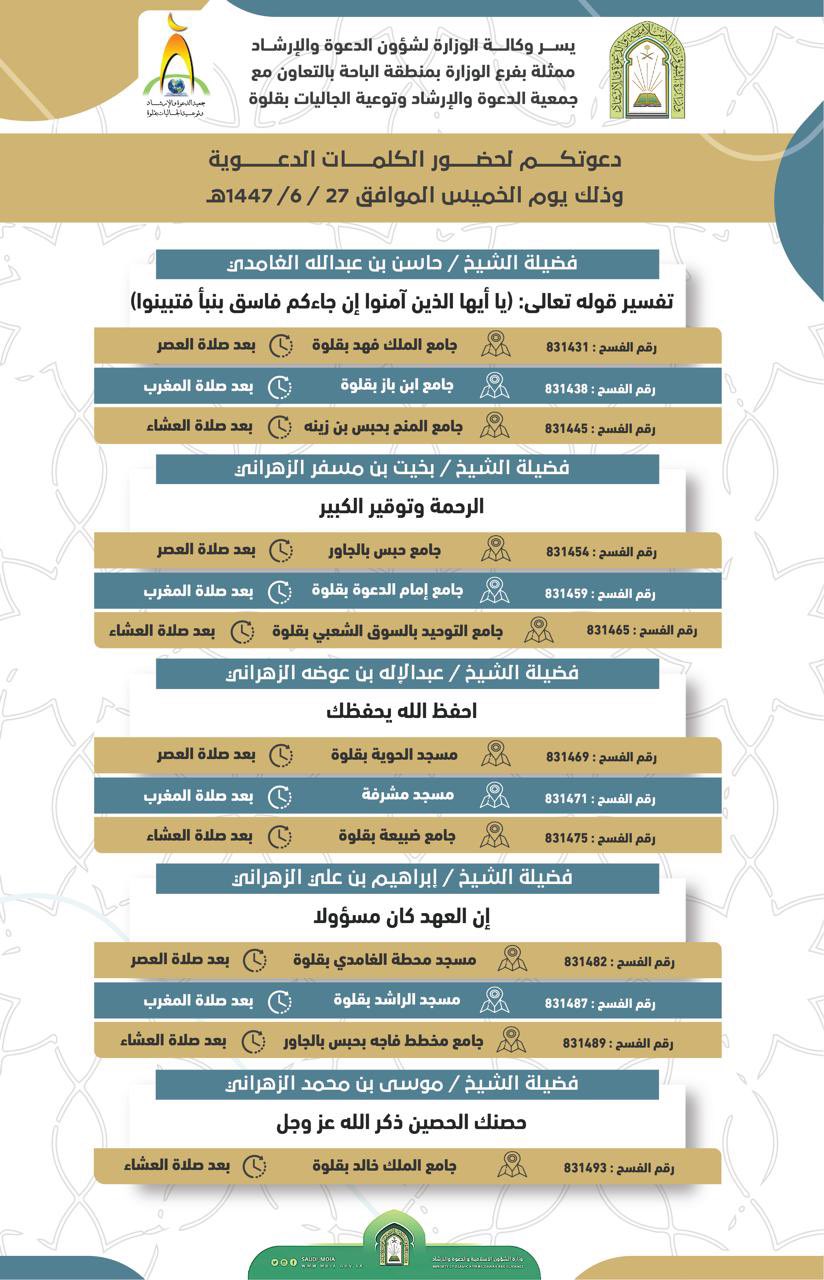 الشؤون الإسلامية بالباحة تنفّذ عددًا من المناشط الدعوية بالمحافظات تنفّذ وزارة الشؤون الإسلامية والدعوة والإرشاد، ممثّلةً بفرعها في منطقة الباحة، وبالتعاون مع جمعيات الدعوة والإرشاد، اليوم الخميس 27 جمادى الآخرة 1447هـ، عددًا من المناشط الدعوية؛ وذلك ضمن برامجها الهادفة 27/جمادى الثانية/1447 التفاصيل