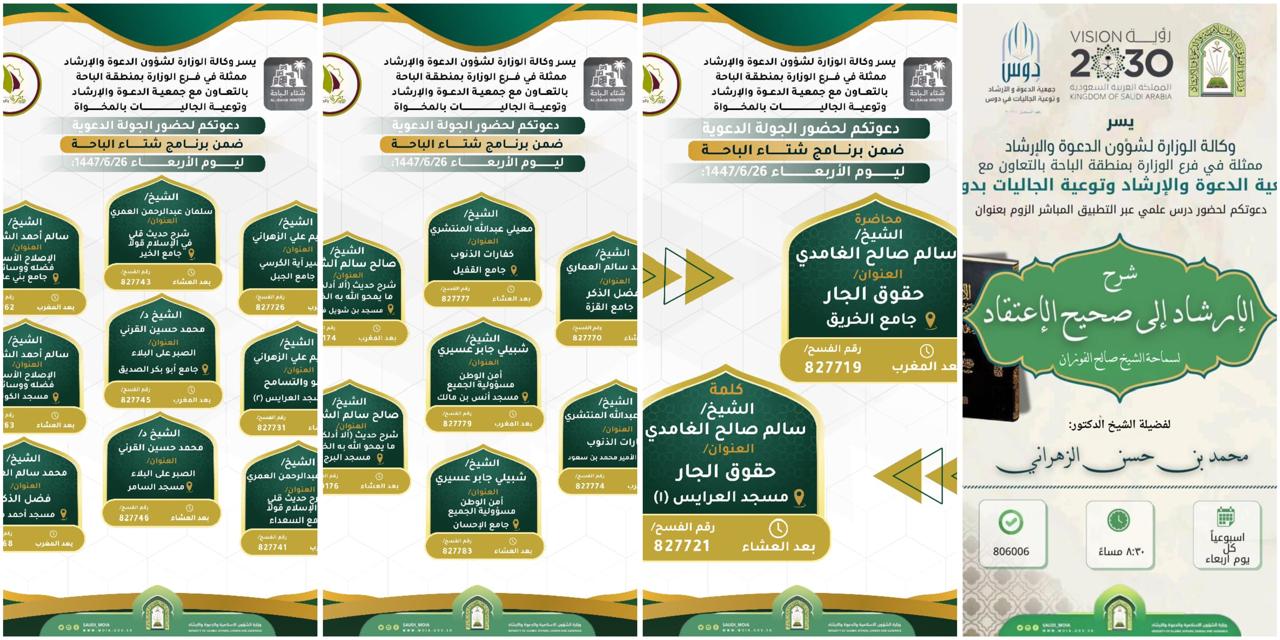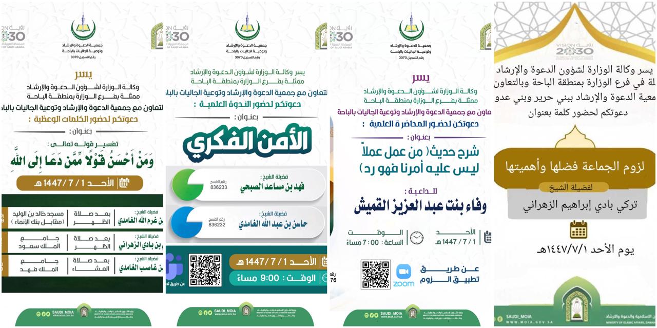 الشؤون الإسلامية بالباحة تُنفّذ مناشط دعوية في محافظات المنطقة خلال شهر رجبتنفّذ وزارةُ الشؤون الإسلامية والدعوة والإرشاد، ممثَّلةً بفرعها في منطقة الباحة، وبالتعاون مع جمعيات الدعوة والإرشاد ببلجرشي وبناوان والأطاولة، ابتداءً من اليوم الأحد غرّة شهر رجب لعام 1447هـ، سلسلةً 01/رجب/1447 التفاصيل