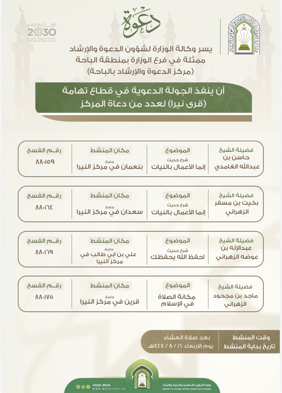 الشؤون الإسلامية بالباحة تُنفّذ مناشط دعوية في بلجرشي والعقيق والأطاولةتُنفّذ وزارةُ الشؤون الإسلامية والدعوة والإرشاد، ممثّلةً بفرعها في منطقة الباحة، وبالتعاون مع جمعيات الدعوة والإرشاد بالمنطقة ومحافظاتها، عددًا من المناشط الدعوية خلال أيام ( الاثنين والثلاثاء والأربعاء 16/شعبان/1447 التفاصيل