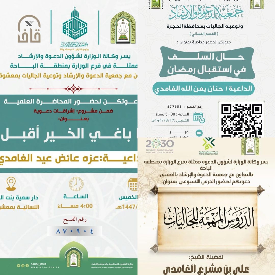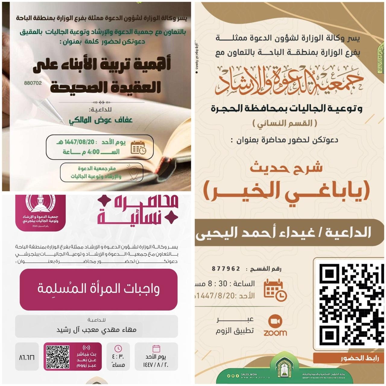 برامج علمية متنوّعة تُقيمها الشؤون الإسلامية بالباحةتُقيم وزارةُ الشؤون الإسلامية والدعوة والإرشاد، ممثّلةً بفرعها في منطقة الباحة، وبالتعاون مع جمعيتي الدعوة والإرشاد بمدينة الباحة ومحافظة الأطاولة، برامجَ علميةً متنوّعة خلال أيام الاثنين والثلاثاء والأربعاء 16/شعبان/1447 التفاصيل