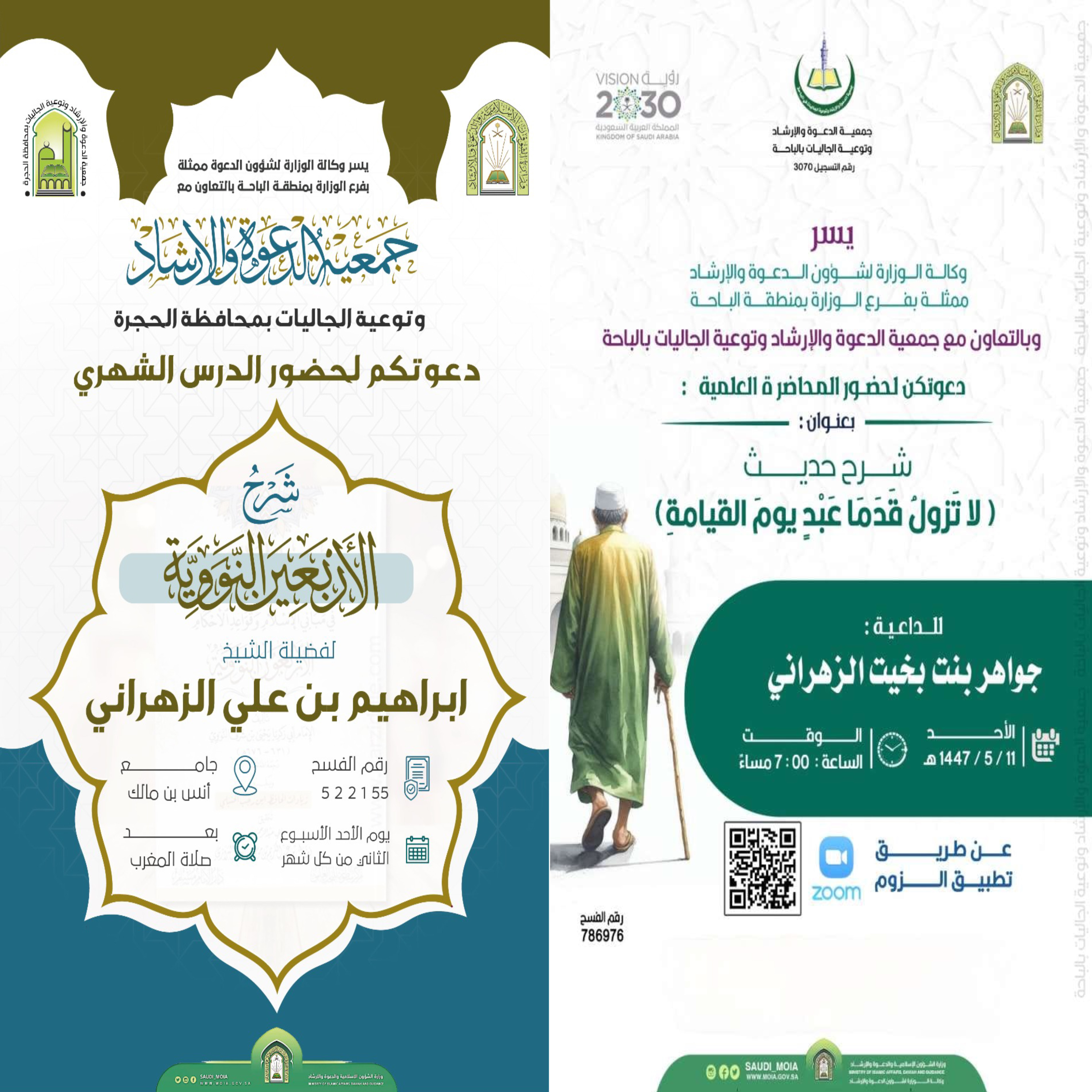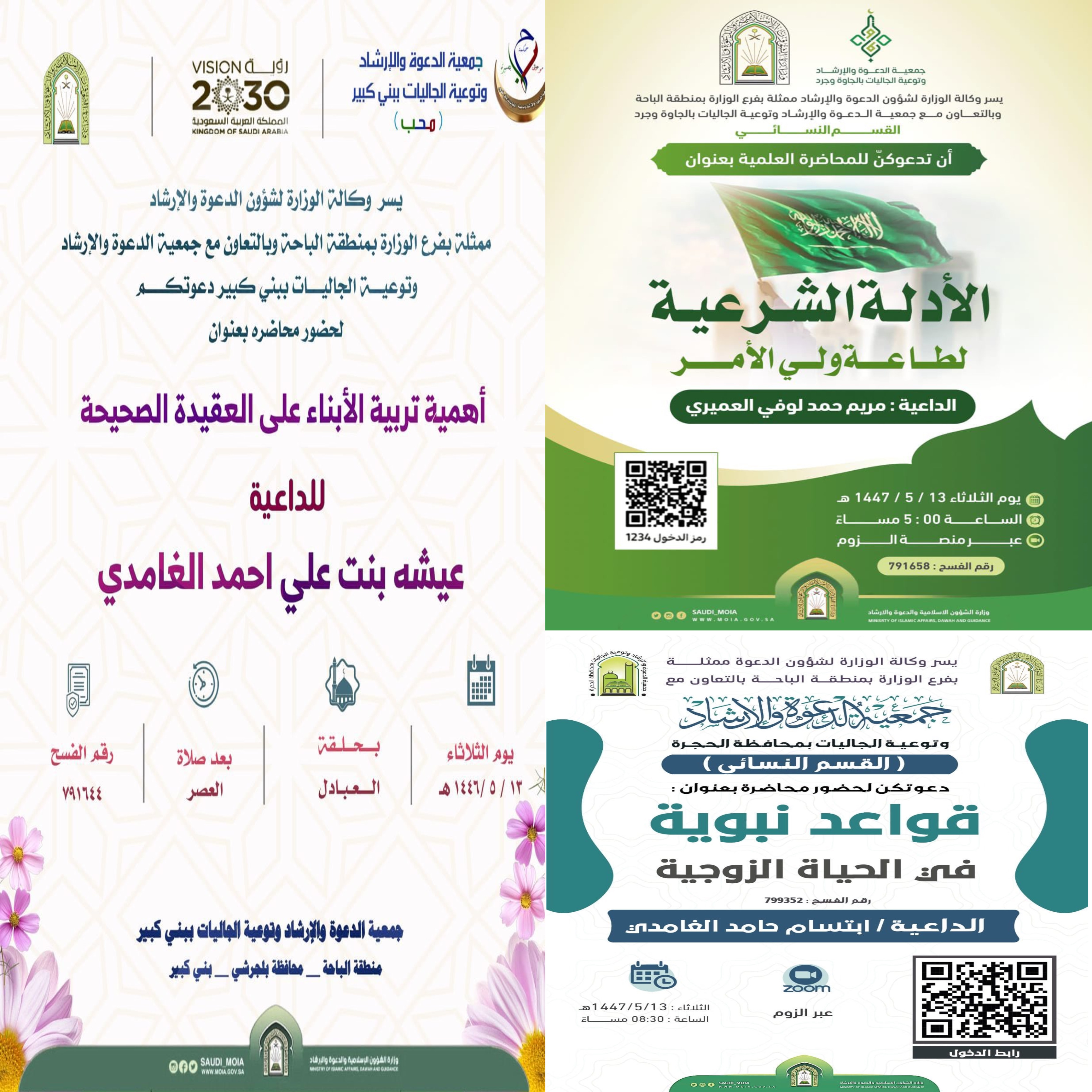 الشؤون الإسلامية بالباحة تنظم ثلاث محاضرات دعوية نسائية في عددٍ من محافظات المنطقةتنظّم وزارة الشؤون الإسلامية والدعوة والإرشاد في منطقة الباحة، وبالتعاون مع جمعيات الدعوة والإرشاد وتوعية الجاليات في المنطقة ومحافظاتها – القسم النسائي – اليوم الثلاثاء الثالث عشر من شهر جمادى الأولى 13/جمادى الأولى/1447 التفاصيل