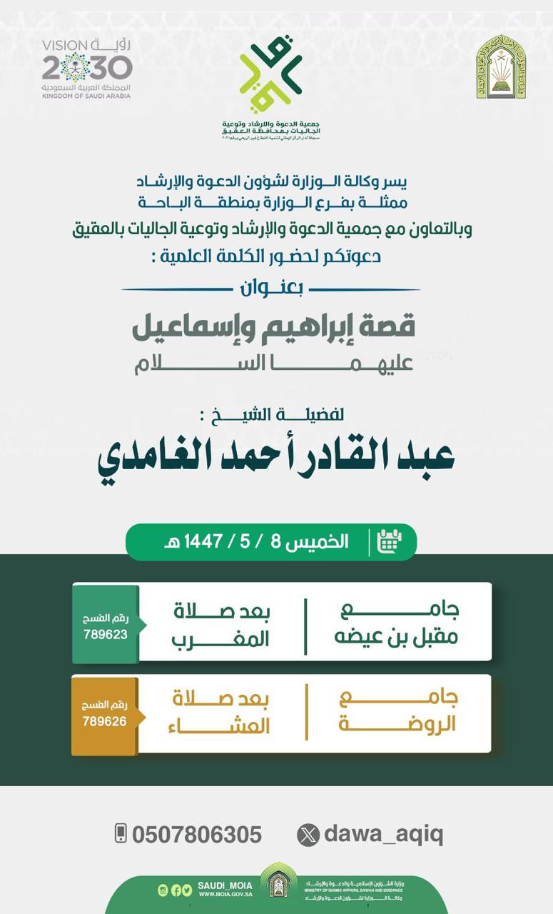 الشؤون الإسلامية بالباحة تُنظّم كلمات دعوية ومحاضرة نسائية ودرسًا علميًا في العقيق ودوسنظّم فرع وزارة الشؤون الإسلامية والدعوة والإرشاد بمنطقة الباحة، بالتعاون مع جمعيات الدعوة والإرشاد وتوعية الجاليات في الباحة ودوس والعقيق، يوم الثلاثاء الموافق الثالث عشر من شهر جمادى الأولى لعام 1447هـ، 14/جمادى الأولى/1447 التفاصيل