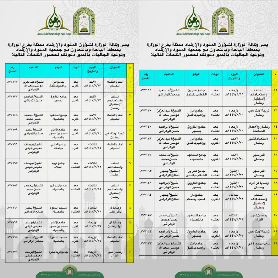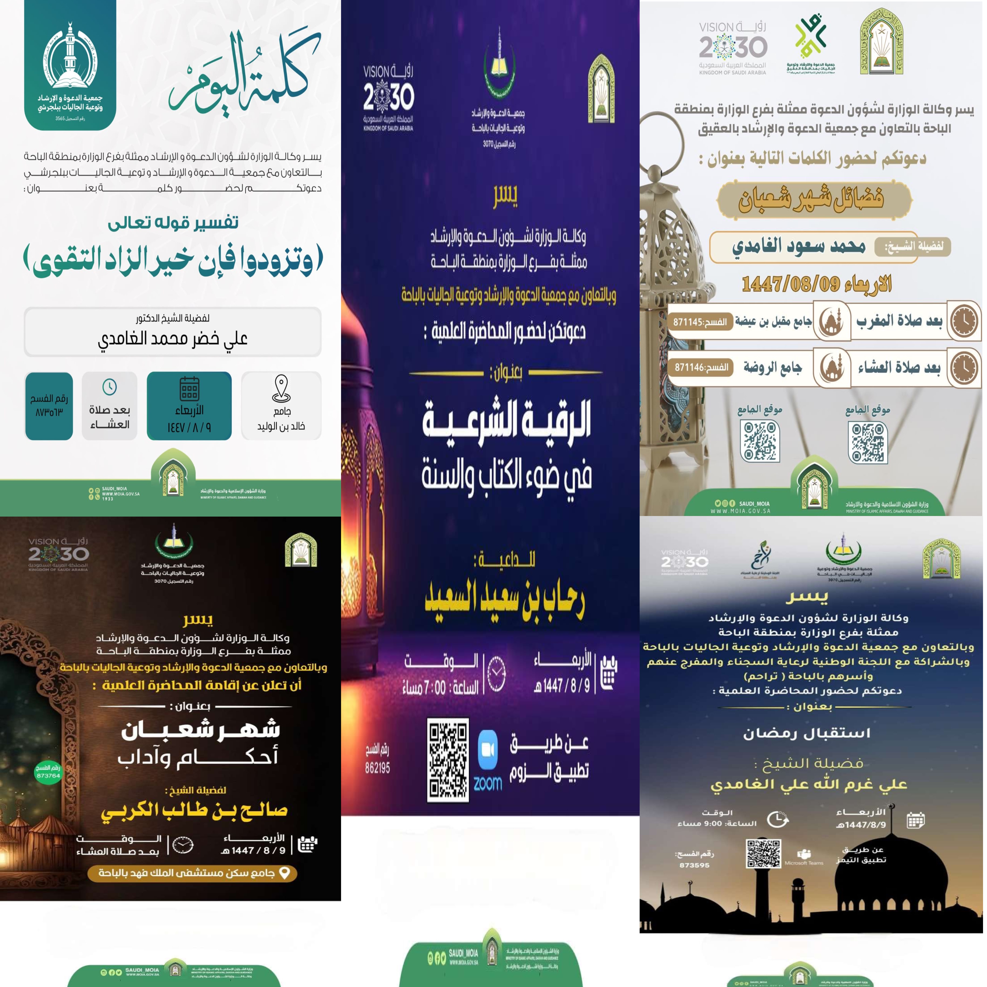 الشؤون الإسلامية بالباحة تُنفّذ مناشط دعويةتُنفّذ وزارة الشؤون الإسلامية والدعوة والإرشاد، ممثّلةً بفرعها في منطقة الباحة، وبالتعاون مع جمعيات الدعوة والإرشاد بالمنطقة ومحافظاتها، سلسلةً من المناشط الدعوية خلال يومي السبت والأحد 12–13 من شهر 14/شعبان/1447 التفاصيل