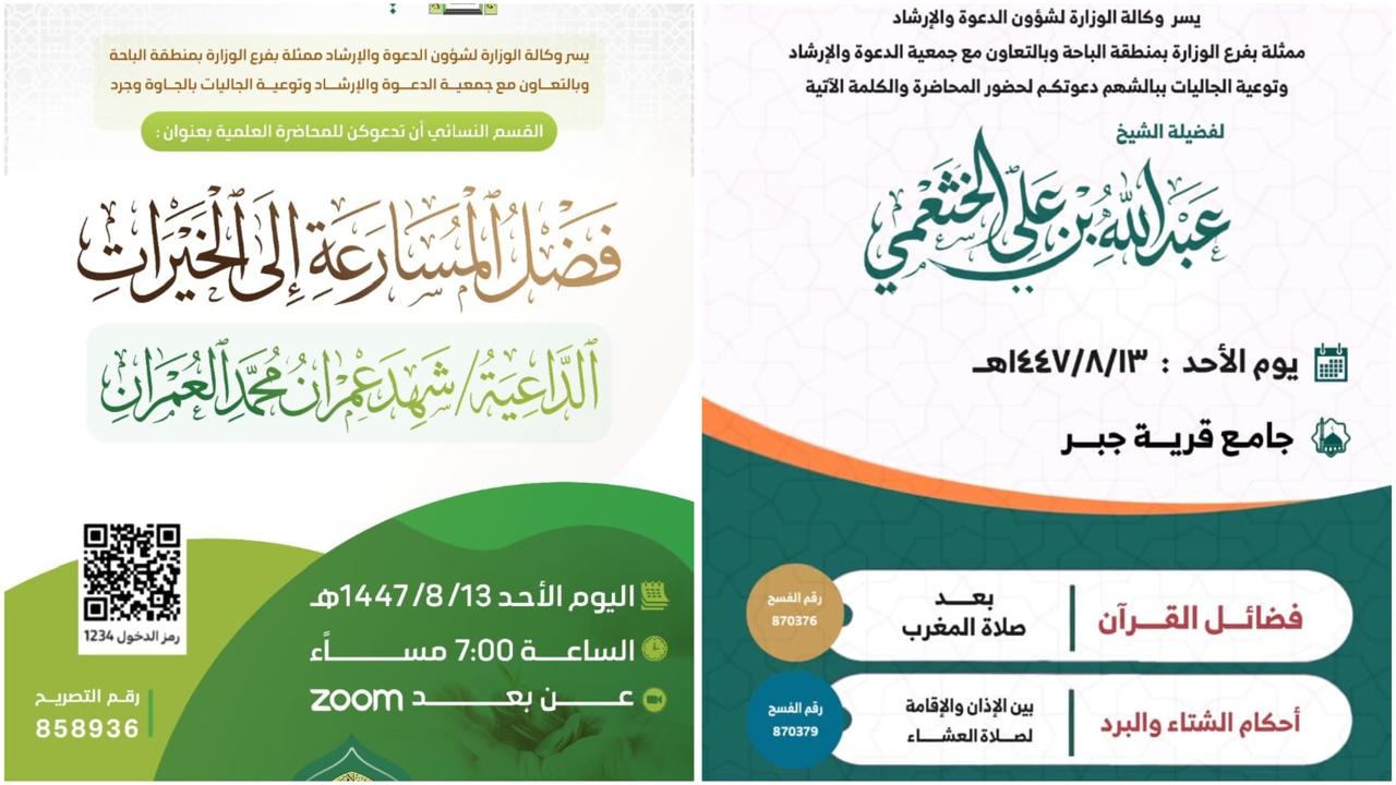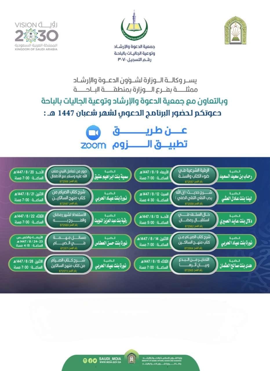 الشؤون الإسلامية بالباحة تطلق برنامجًا دعويًا نسائيًا خلال شهر شعبان عبر منصة الزوومأطلقت وزارة الشؤون الإسلامية والدعوة والإرشاد، ممثّلةً بفرعها في منطقة الباحة، وبالتعاون مع جمعية الدعوة والإرشاد وتوعية الجاليات بمدينة الباحة ، برنامجًا دعويًا نسائيًا ، ابتداءً من يوم الأربعاء التاسع 14/شعبان/1447 التفاصيل