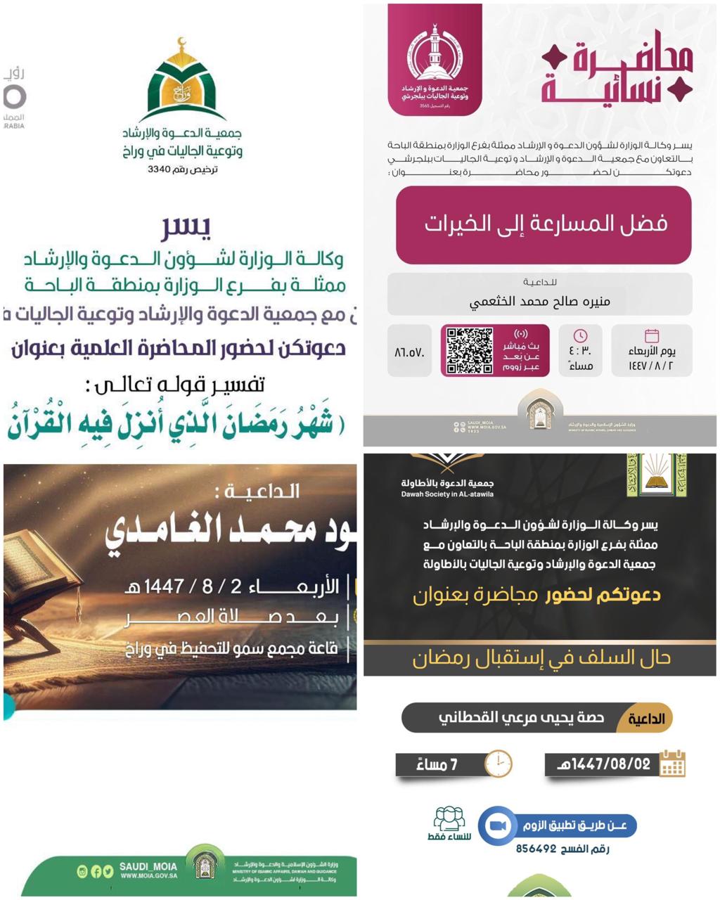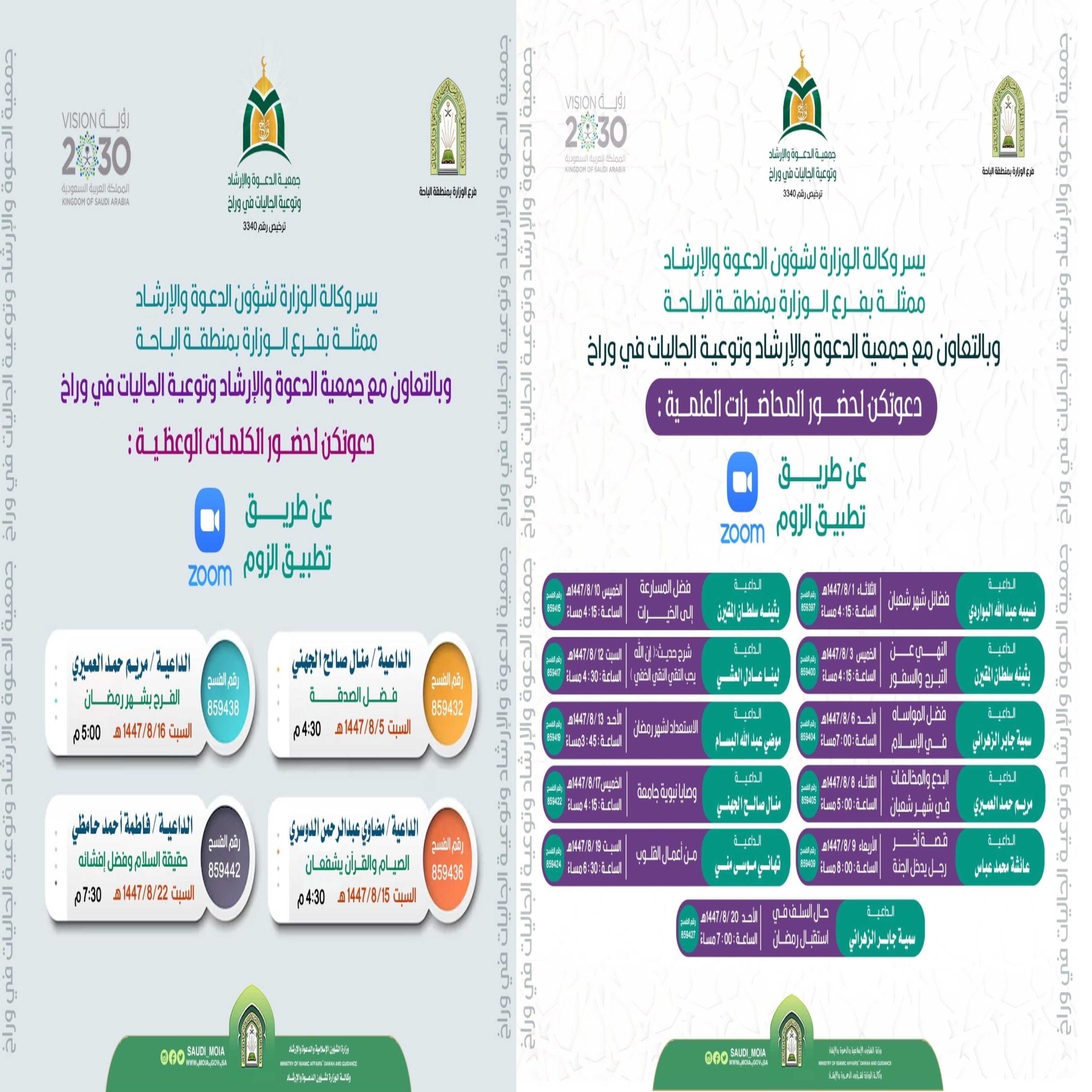 الشؤون الإسلامية بالباحة تُنفّذ مناشط دعوية نسائية عبر منصة الزووم خلال شهر شعبانتُنفّذ وزارةُ الشؤون الإسلامية والدعوة والإرشاد بمنطقة الباحة، وبالتعاون مع جمعية الدعوة والإرشاد وتوعية الجاليات في وراخ، خلال شهر شعبان لعام 1447هـ، سلسلةً من المناشط الدعوية النسائية، وذلك ضمن جهودها 30/رجب/1447 التفاصيل