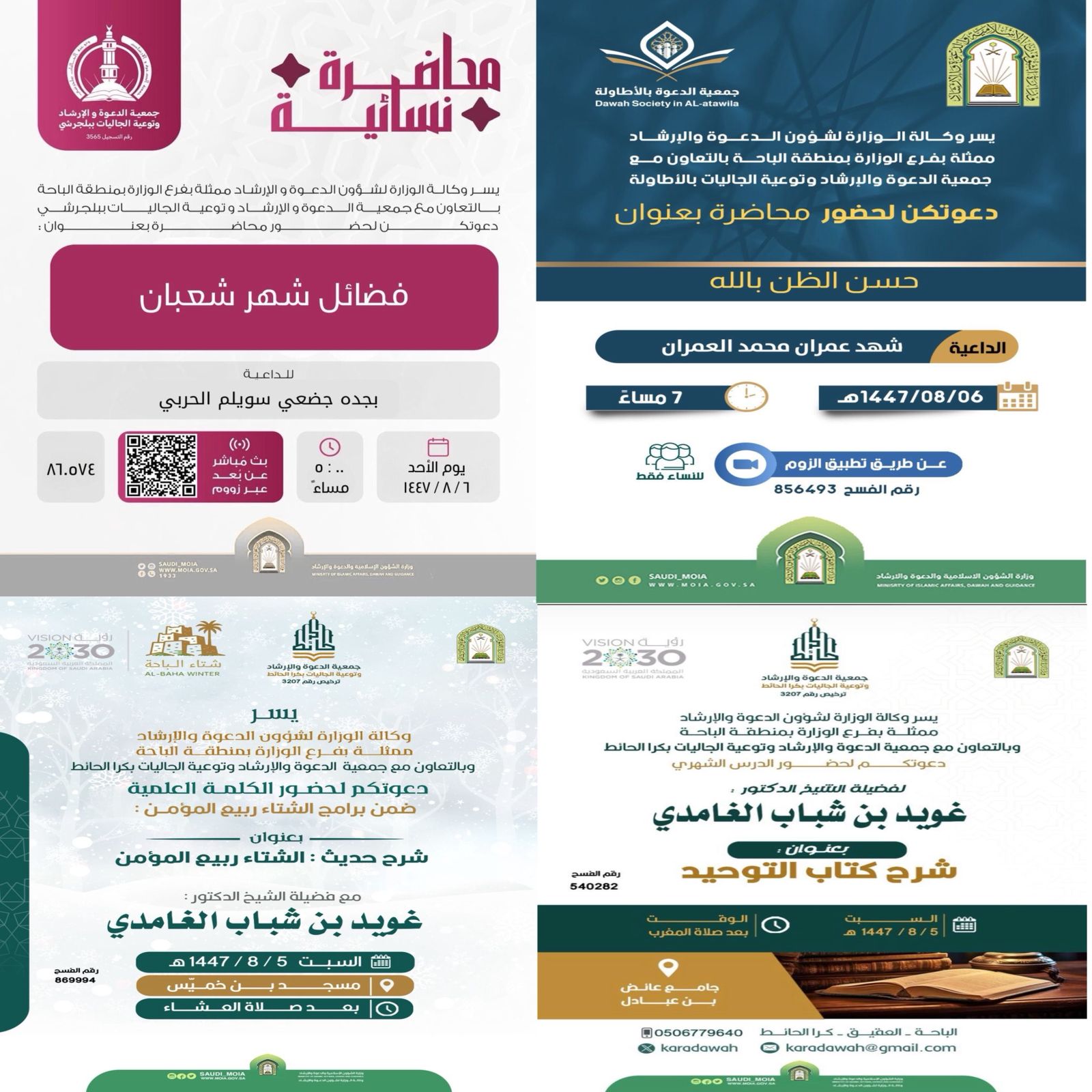 مناشط دعوية متنوعة تنفذها الشؤون الإسلامية بالباحة في عددٍ من محافظات المنطقةفي إطار جهودها المستمرة لنشر العلم الشرعي وتعزيز القيم الإسلامية، تُنفّذ وزارةُ الشؤون الإسلامية والدعوة والإرشاد، ممثَّلةً بفرعها في منطقة الباحة، وبالتعاون مع جمعيات الدعوة والإرشاد بالمنطقة ومحافظاتها، 06/شعبان/1447 التفاصيل