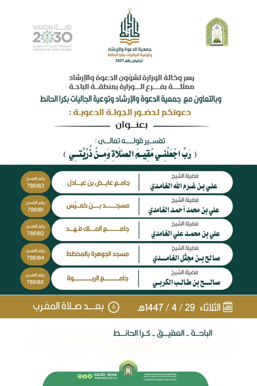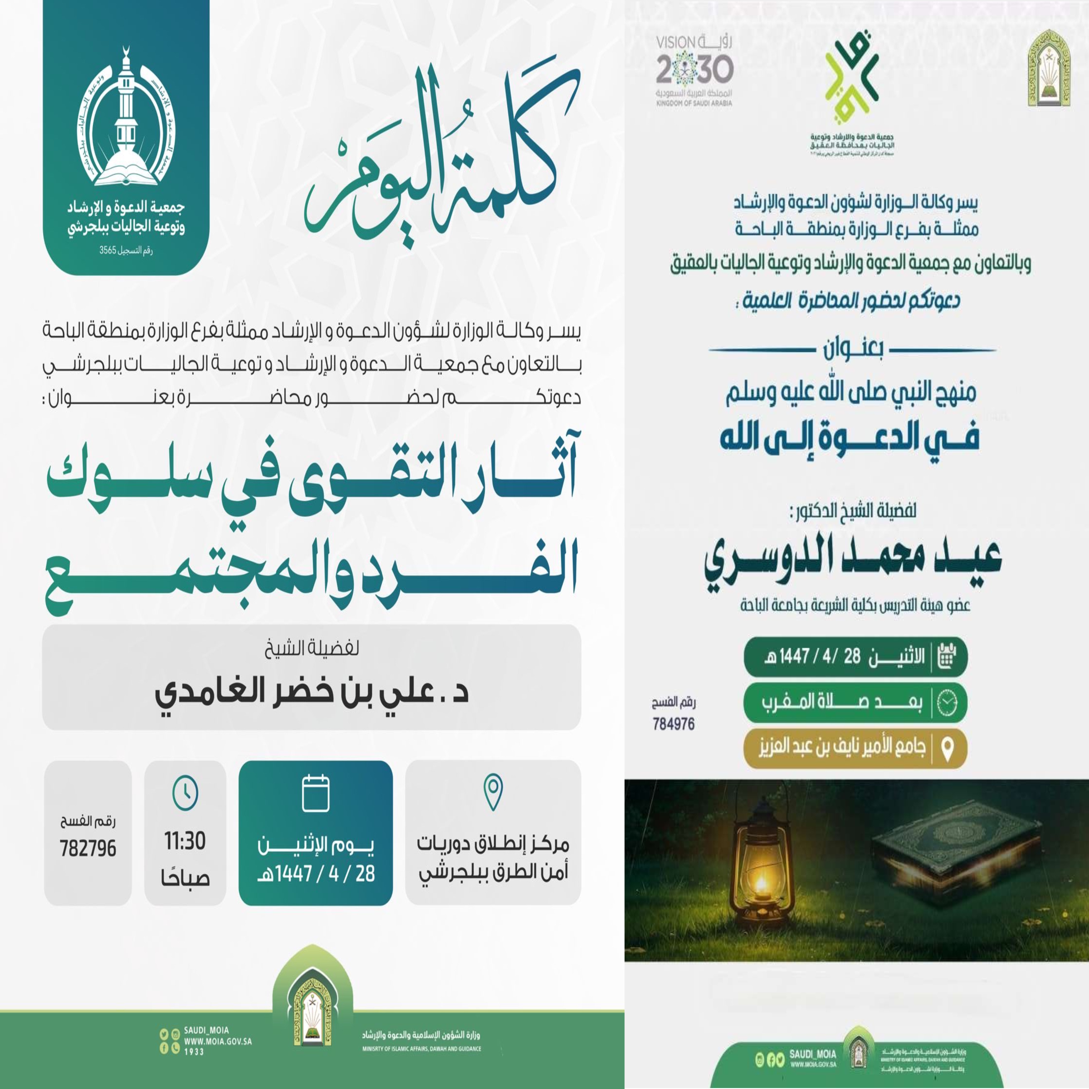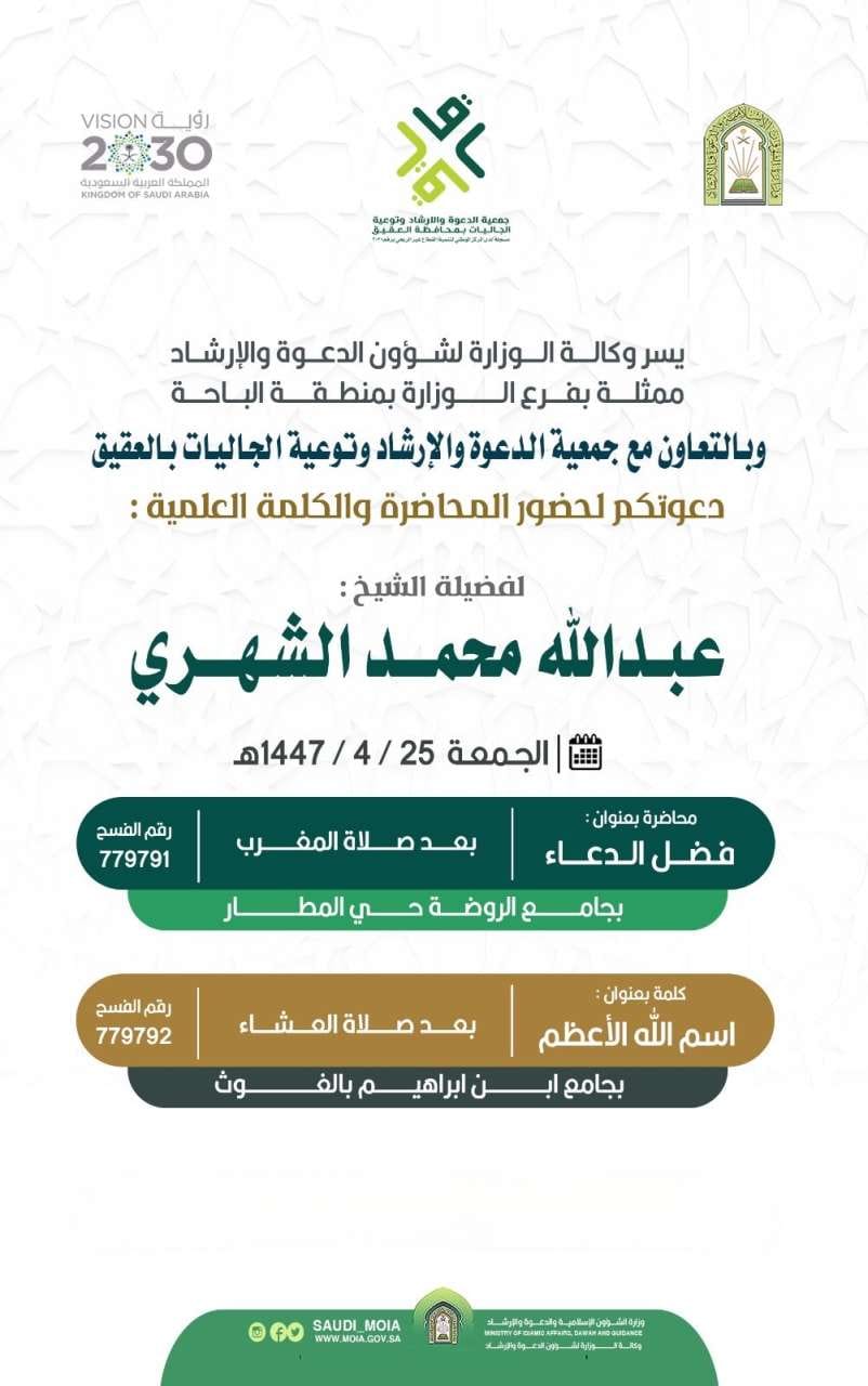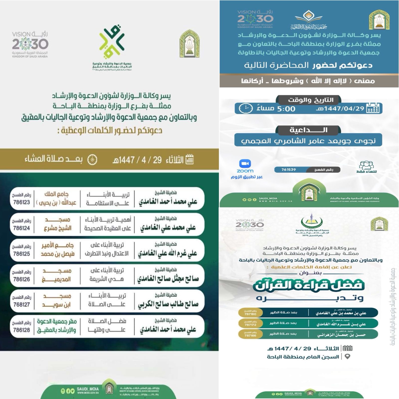 مناشط دعوية يُقيمها فرع الشؤون الإسلامية بالباحة في عددٍ من محافظات المنطقةأقام فرع وزارة الشؤون الإسلامية والدعوة والإرشاد بمنطقة الباحة بالتعاون مع جمعيات الدعوة والإرشاد وتوعية الجاليات في عددٍ من محافظات المنطقة، لـ يومي الجمعة والسبت 25–26 ربيع الآخر 1447هـ، عددًا من 27/ربيع الثاني/1447 التفاصيل