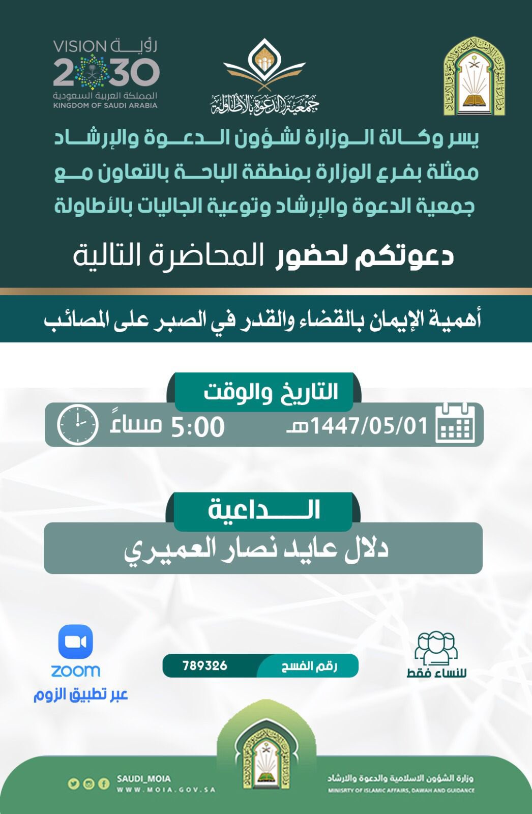 سلسلة من المحاضرات الدعوية النسائية تنفّذها الشؤون الإسلامية بالباحةتنفّذ وزارة الشؤون الإسلامية والدعوة والإرشاد بمنطقة الباحة وبالتعاون مع جمعيات الدعوة والإرشاد وتوعية الجاليات بالأطاولة وبكرا الحائط، يومي الخميس والجمعة 1 - 2 جمادى الأولى 1447هـ، سلسلةً من المحاضرات 01/جمادى الأولى/1447 التفاصيل