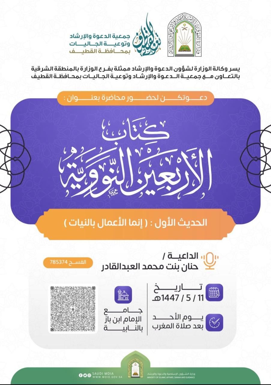 فرع الشؤون الإسلامية بالشرقية ينفذ سلسلة من المحاضرات الدعوية وكلمة علمية للنساء بالقطيف والجبيلMOIA11/جمادى الأولى/1447MOIAالإدارة العامة للإعلام والإتصال المؤسسيفرع المنطقة الشرقية يقيم سلسلة محاضرات وكلمة للنساء بمحافظتي القطيف والجبيلنفذ فرع وزارة الشؤون الإسلامية والدعوة والإرشاد بالمنطقة الشرقية، بالتعاون مع جمعيتي الدعوة والإرشاد وتوعية الجاليات بمحافظتَي القطيف والجبيل، يوم الأحد الحادي عشر من شهر جمادى الأولى لعام 1447هـ، سلسلة من المحاضرات الدعوية وكلمة علمية للنساء. حيث ألقيت بالنابية بمحافظة القطيف محاضرة دعوية بعنوان: "كتاب الأربعين النووية" بجامع الإمام ابن باز في النابية بعد صلاة المغرب، وفي محافظة الجبيل ألقيت كلمة دعوية بعنوان: " قيمة الوقت في حياة السلف"، بالإضافة إلى محاضرة دعوية بعنوان: "حسن الظن بالله"، ومحاضرة أخرى بعنوان: "شرح حديث: لا تزول قدما عبدٍ يوم القيامة حتى يُسأل عن أربع". وتأتي هذه المناشط الدعوية في إطار جهود فرع الوزارة بالمنطقة الشرقية، الرامية إلى تعزيز الوعي الديني، ونشر العلم الشرعي، وترسيخ القيم الإسلامية في المجتمع.