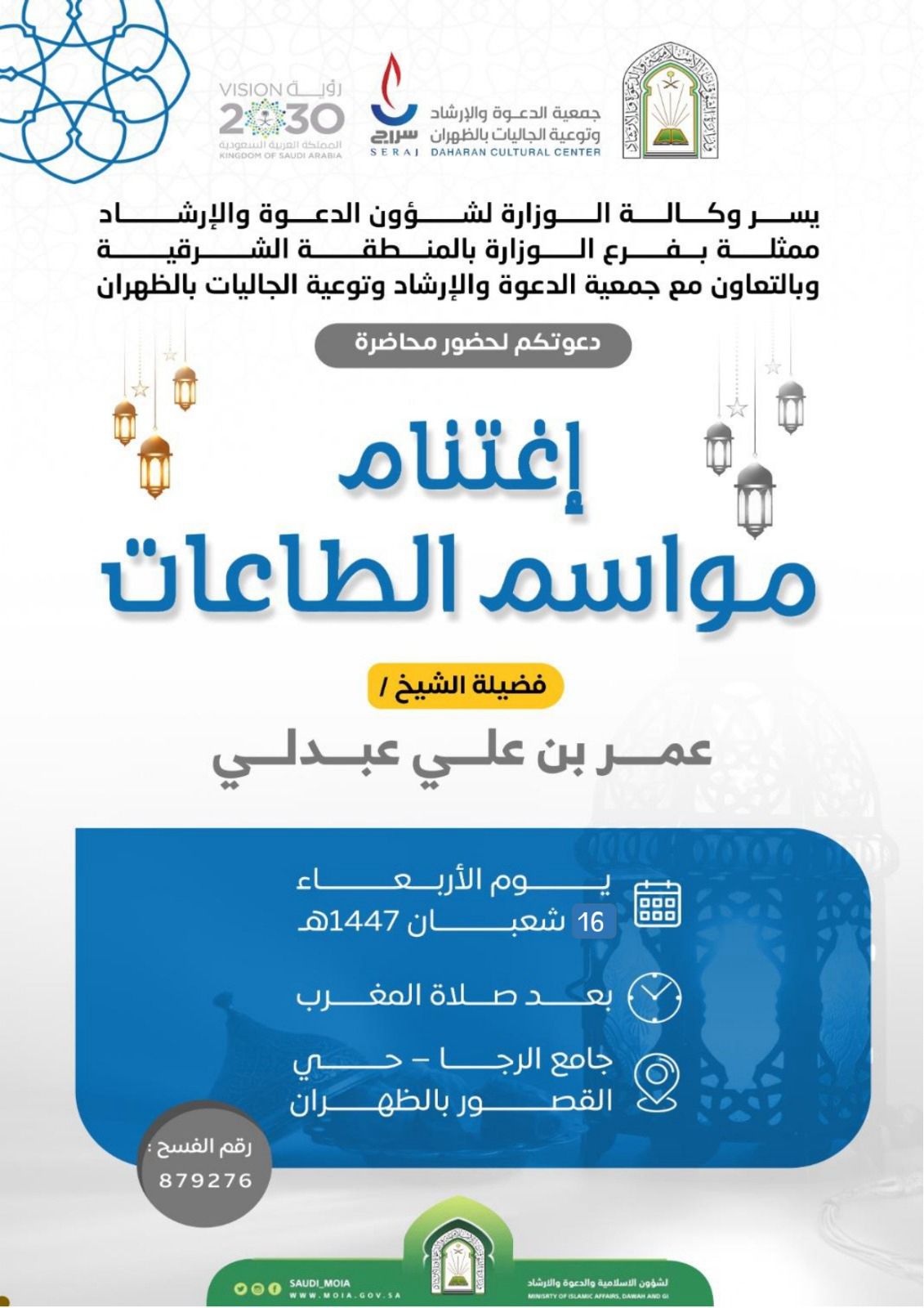 الشؤون الإسلامية بالشرقية تنفذ سلسلة من المحاضرات الدعوية بمحافظة الظهران ومدينة الدمامMOIA16/شعبان/1447MOIAالشؤن الإسلامية بالشرقية تنفذ سلسلة من البرامج الدعوية بمدينة الدمام ومحافظة الظهران تُنفذ وزارة الشؤون الإسلامية والدعوة والإرشاد، ممثلةً بفرعها بالمنطقة الشرقية وبالتعاون مع جمعيات الدعوة والإرشاد وتوعية الجاليات بمحافظة الظهران ومدينة الدمام، اليوم الأربعاء السادس عشر من شهر شعبان ١٤٤٧هـ، سلسلةً من المحاضرات الدعوية، التي يُقدِّمها مجموعةٌ من الدعاة المعتمدين؛ حيث تُقام في محافظة الظهران محاضرة دعوية بعنوان (اغتنام مواسم الطاعات) في جامع الرجاء بحي القصور بعد صلاة المغرب، كما تلقى في مدينة الدمام محاضرة دعوية بعنوان (استقبال رمضان) في مسجد عبد الله المري بحي الشعلة بالدمام بعد صلاة العشاء. وتأتي هذه المحاضرات ضمن المناشط الدعوية التي يُنفِّذها فرع الوزارة في المنطقة الشرقية؛ لتعزيز الوعي الديني، ونشر القيم الإسلامية، وتبصير المجتمع بأمور دينهم، وتشجيعهم على تعلُّم العلم الشرعي.