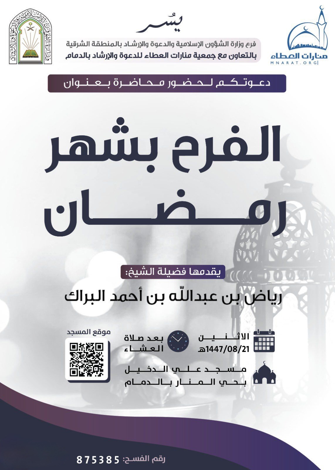 الشؤون الإسلامية بالشرقية تنفذ سلسلة من المحاضرات الدعوية بمدينة الدمامMOIA21/شعبان/1447MOIAالشؤون الإسلامية بالشرقية تنفذ سلسلة محاضرات بمدينة الدمام نفذت وزارة الشؤون الإسلامية والدعوة والإرشاد، ممثلةً بفرعها في المنطقة الشرقية، وبالتعاون مع جمعيات الدعوة والإرشاد وتوعية الجاليات بالدمام، يوم الاثنين الحادي والعشرين من شهر شعبان لعام 1447هـ، سلسلةً من المحاضرات الدعوية. حيث ألقيت في مدينة الدمام محاضرة دعوية عن بُعد بعنوان: واجبات المرأة المسلمة، عند الساعة الرابعة مساءً، فيما أقيمت بعد صلاة المغرب محاضرة بعنوان: فضل التوحيد وثمراته، في جامع الشيخ عبدالعزيز الخريجي بحي الفيصلية، وعقب صلاة العشاء ألقيت محاضرتان؛ الأولى بعنوان: الشكر حقيقته وآثاره، في جامع سليمان المعجل، والثانية بعنوان: الفرح بشهر رمضان، في مسجد علي الدخيل. وتأتي هذه المناشط ضمن جهود فرع الوزارة بالمنطقة الشرقية؛ بهدف تعزيز الوعي الديني، ونشر القيم الإسلامية، وتبصير المجتمع بأمور دينهم، وتشجيعهم على تعلم العلم الشرعي.
