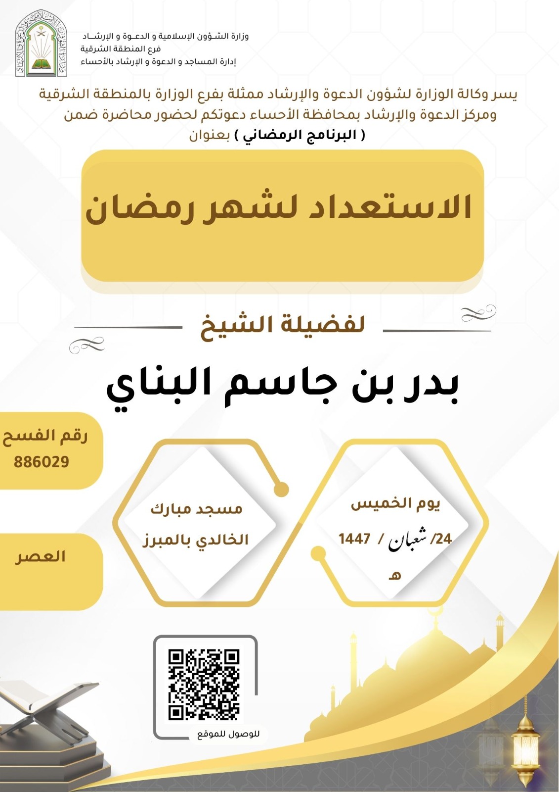 الشؤون الإسلامية بالشرقية تنفذ سلسلة من المحاضرات الدعوية في محافظتي الأحساء والخبر ومدينة الدمامMOIA24/شعبان/1447MOIAالإدارة العامة للإعلام والإتصال المؤسسيالشؤون الإسلامية بالشرقية تنفذ سلسلة محاضرات في مدينة الدمام ومحافظتي الأحساء والخبر نفذت وزارة الشؤون الإسلامية والدعوة والإرشاد، ممثلةً بفرعها بالمنطقة الشرقية، وبالتعاون مع جمعيات الدعوة والإرشاد وتوعية الجاليات، في مدينة الدمام ومحافظتي الأحساء والخبر، يوم الخميس 24/8/1447هـ، سلسلة من المحاضرات والدورات العلمية في عددٍ من جوامع المنطقة. ففي محافظة الأحساء ألقي برنامج رمضاني بعنوان: الاستعداد لشهر رمضان، بعد صلاة العصر، في مسجد مبارك الخالدي بالمبرز. وفي مدينة الدمام أقيمت محاضرة بعنوان: أحكام وفضائل الصيام، بعد صلاة المغرب، في جامع أحمد الغامدي بحي المنار، كما ألقيت فيه محاضرتان للنساء في الجامع ذاته؛ الأولى بعنوان: فضائل شهر رمضان، بعد صلاة العصر، والأخرى بعنوان: آيات الصيام بعد صلاة المغرب. وفي محافظة الخبر ألقيت دورة علمية بعنوان: شرح كتاب الصيام من بلوغ المرام، بعد صلاتي المغرب والعشاء، في جامع عبدالله وعبدالرحمن الفهري -رحمهما الله- بحي التحلية. وتأتي هذه المناشط ضمن البرامج الدعوية التي ينفّذها فرع الوزارة بالمنطقة الشرقية، سعيًا إلى نشر الوعي الشرعي، وتعزيز القيم الإيمانية، ورفع مستوى الارتباط بمواسم الخير.