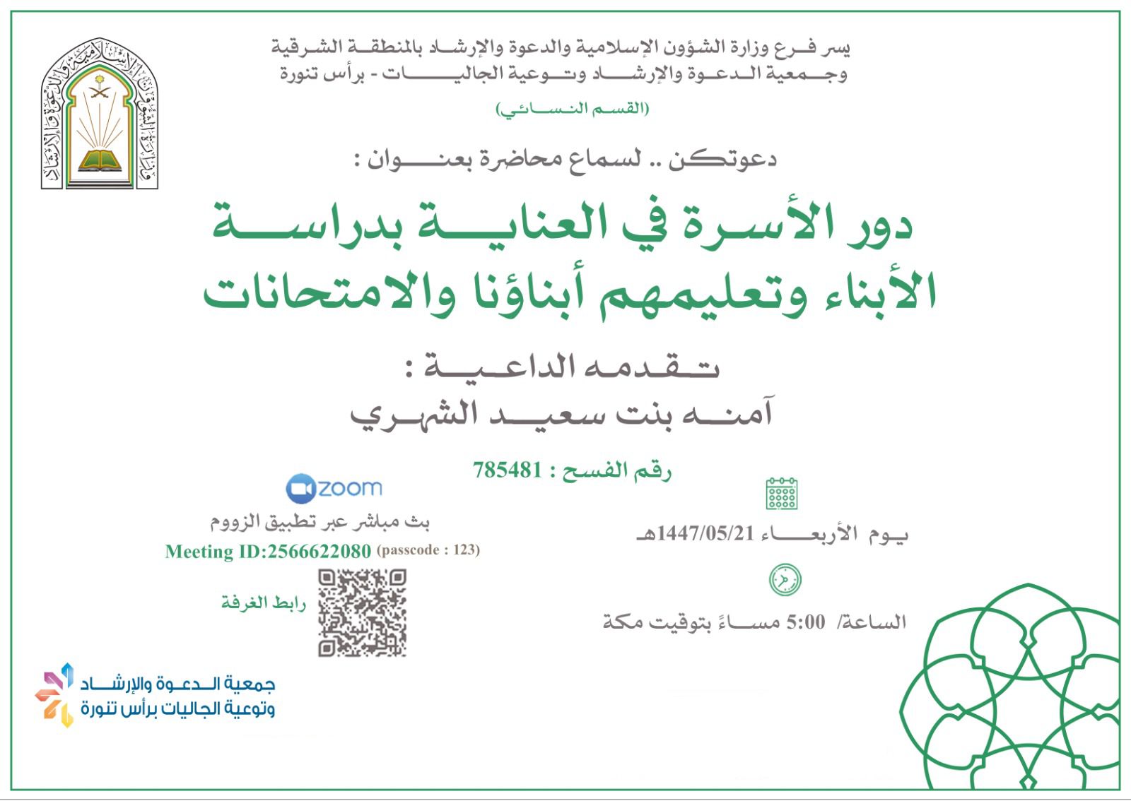 فرع الشؤون الإسلامية بالشرقية ينفذ سلسلة محاضرات دعوية وتربوية بمحافظة رأس تنورة ومدينة الدمامنفذ فرع وزارة الشؤون الإسلامية والدعوة والإرشاد بالمنطقة الشرقية، وبالتعاون مع جمعيات الدعوة والإرشاد وتوعية الجاليات بمحافظة رأس تنورة ومدينة الدمام، يوم الثلاثاء العشرين من جمادى الأولى لعام 20/جمادى الأولى/1447 التفاصيل